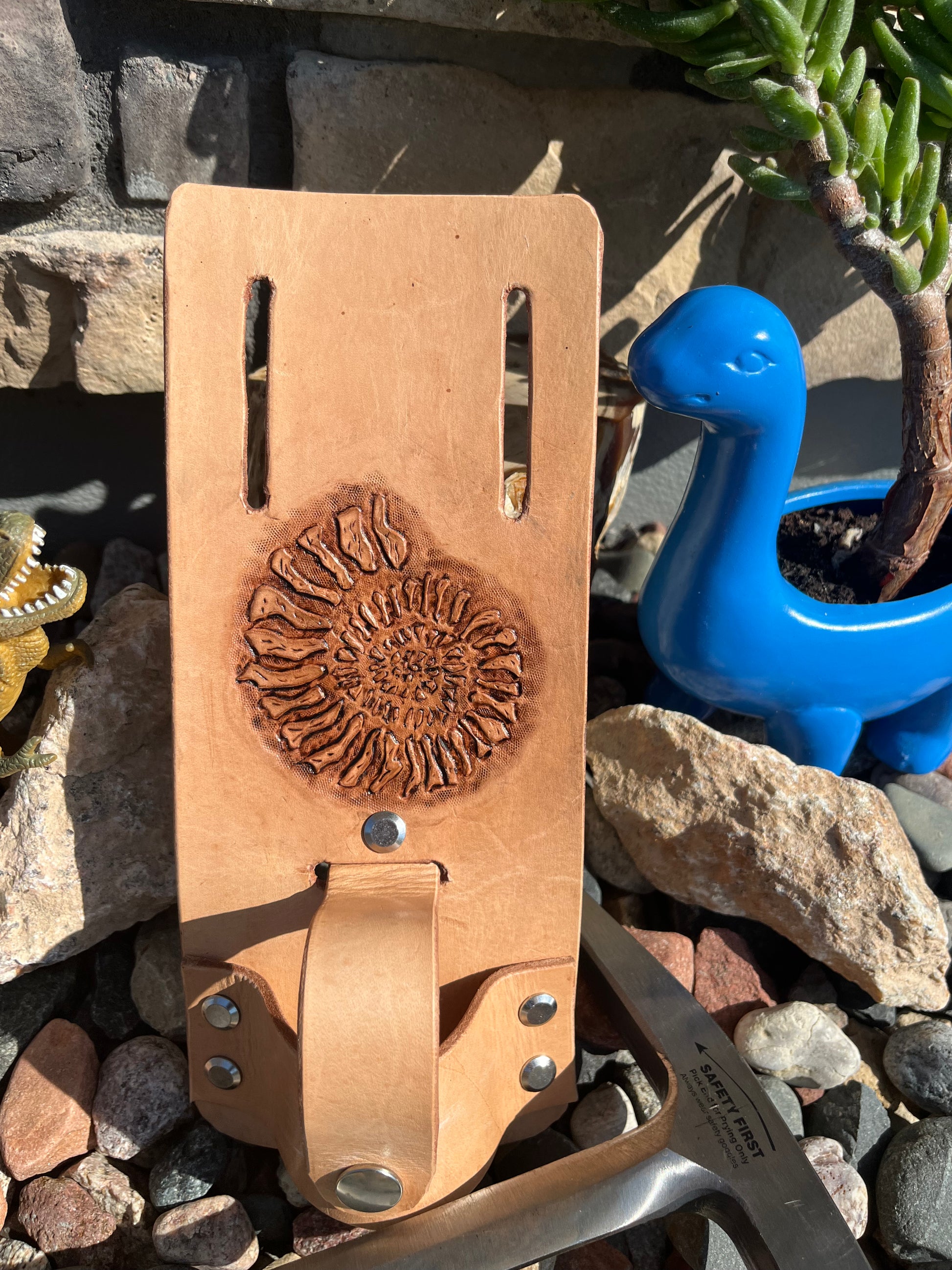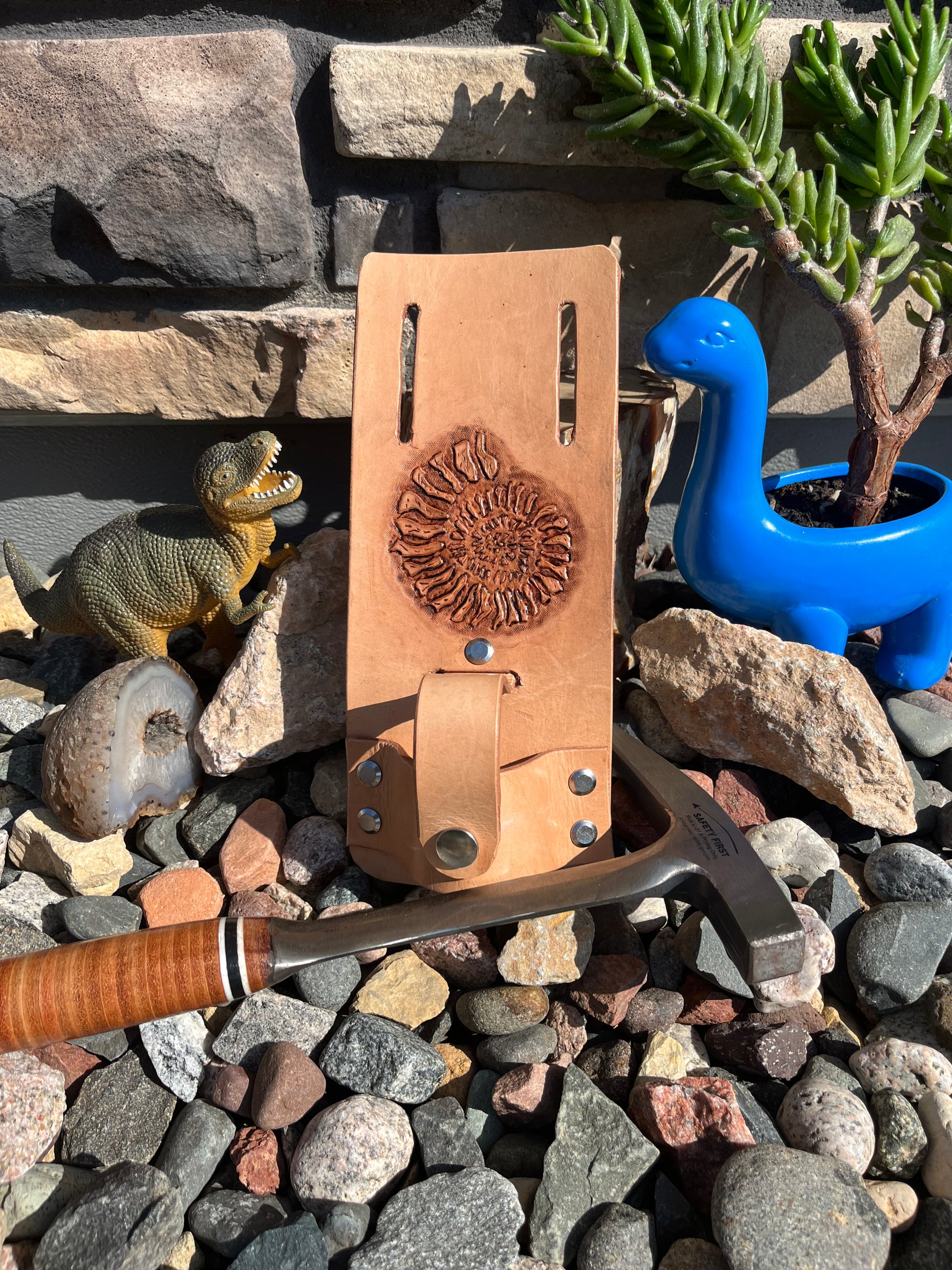 This Rock Hammer Holster features a hand tooled and antiqued ammonite fossil and is made with a thick and sturdy 100% full grain veg tan leather. It is riveted together with heavy duty Chicago screws that have been set with loc-tite. Slide it on your belt, and snap your rock hammer in, and you are ready to go.