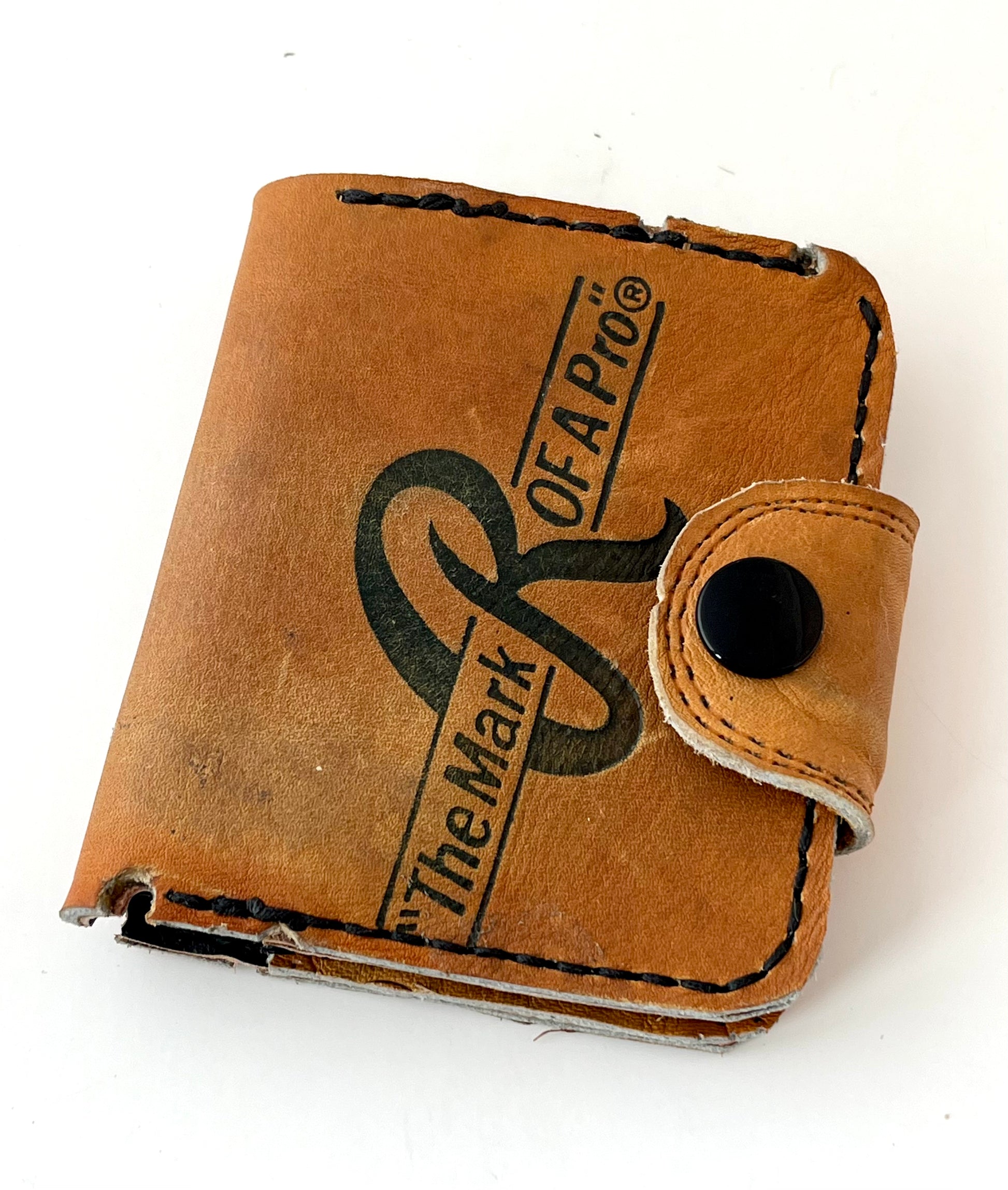 This small 2-pocket vertical wallet is made from the same Rawlings catchers mitt as our Long Wallet and Billfold. Lined with hand dyed veg tan, it has 2 card pockets and a closure snap you so can toss this wallet in a bag as well as just in your pocket.
