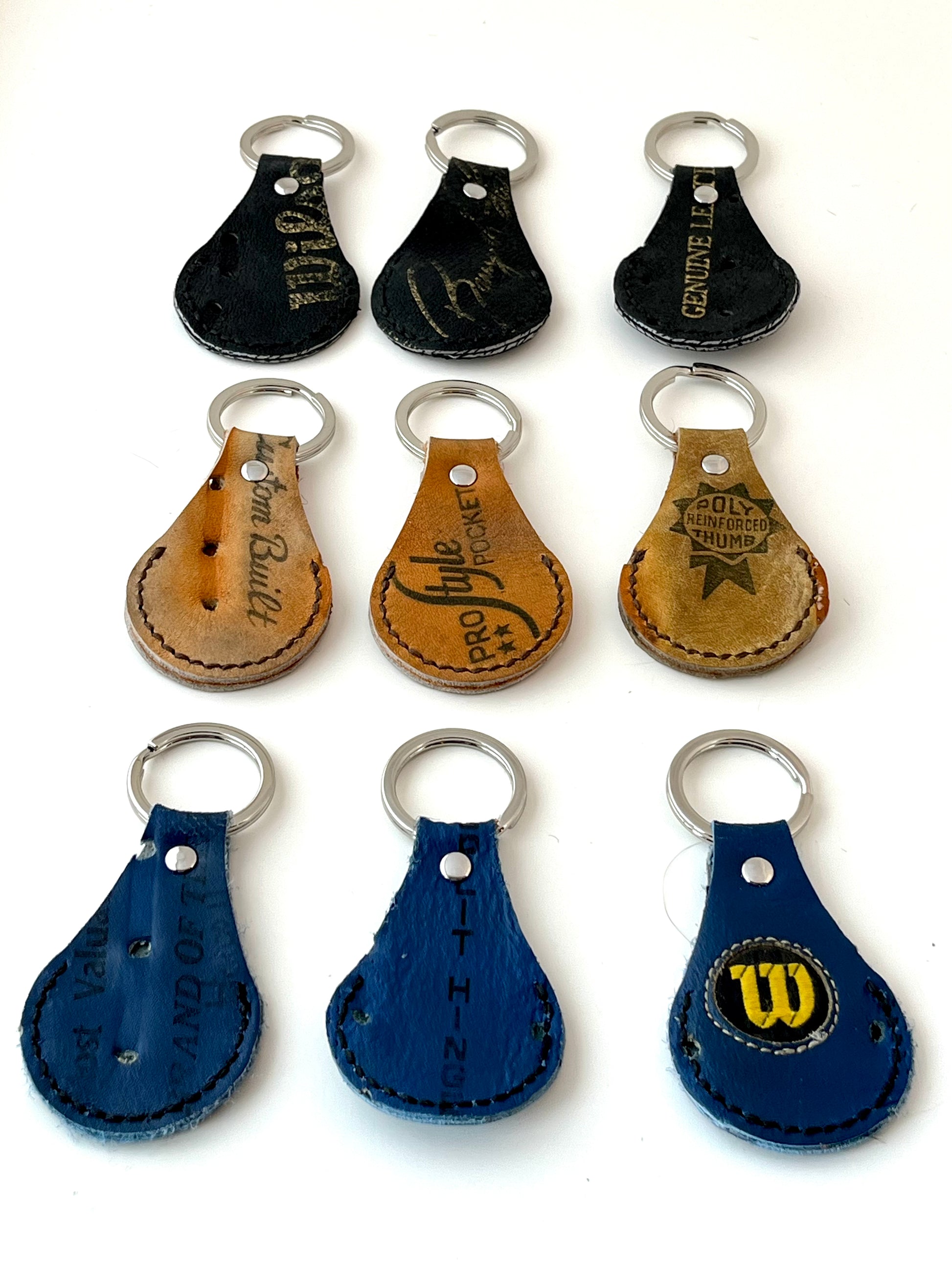Softball and baseball season is upon us! Show your love of the sport with these keychains made of old gloves. Diamond Master and Wilson gloves make up this set of 9 unique keychains.