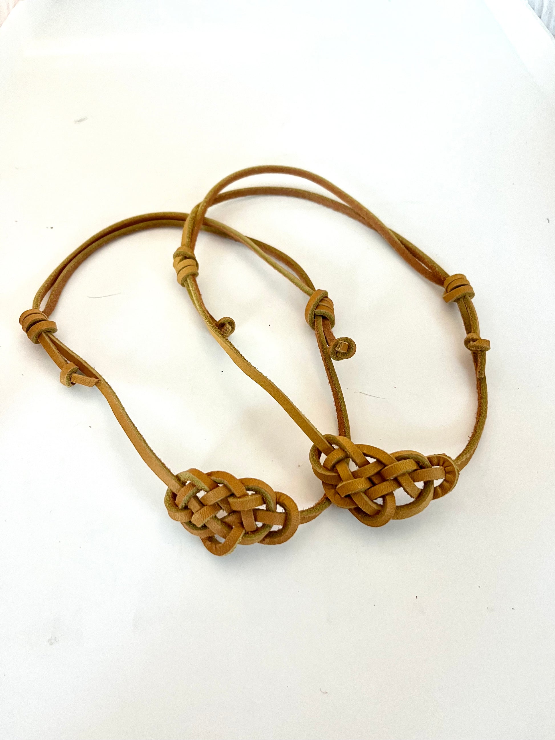 This necklace has been hand knotted with Latigo lace leather. It is 100% leather with a cinching knot system to loosen and tighten the necklace.
