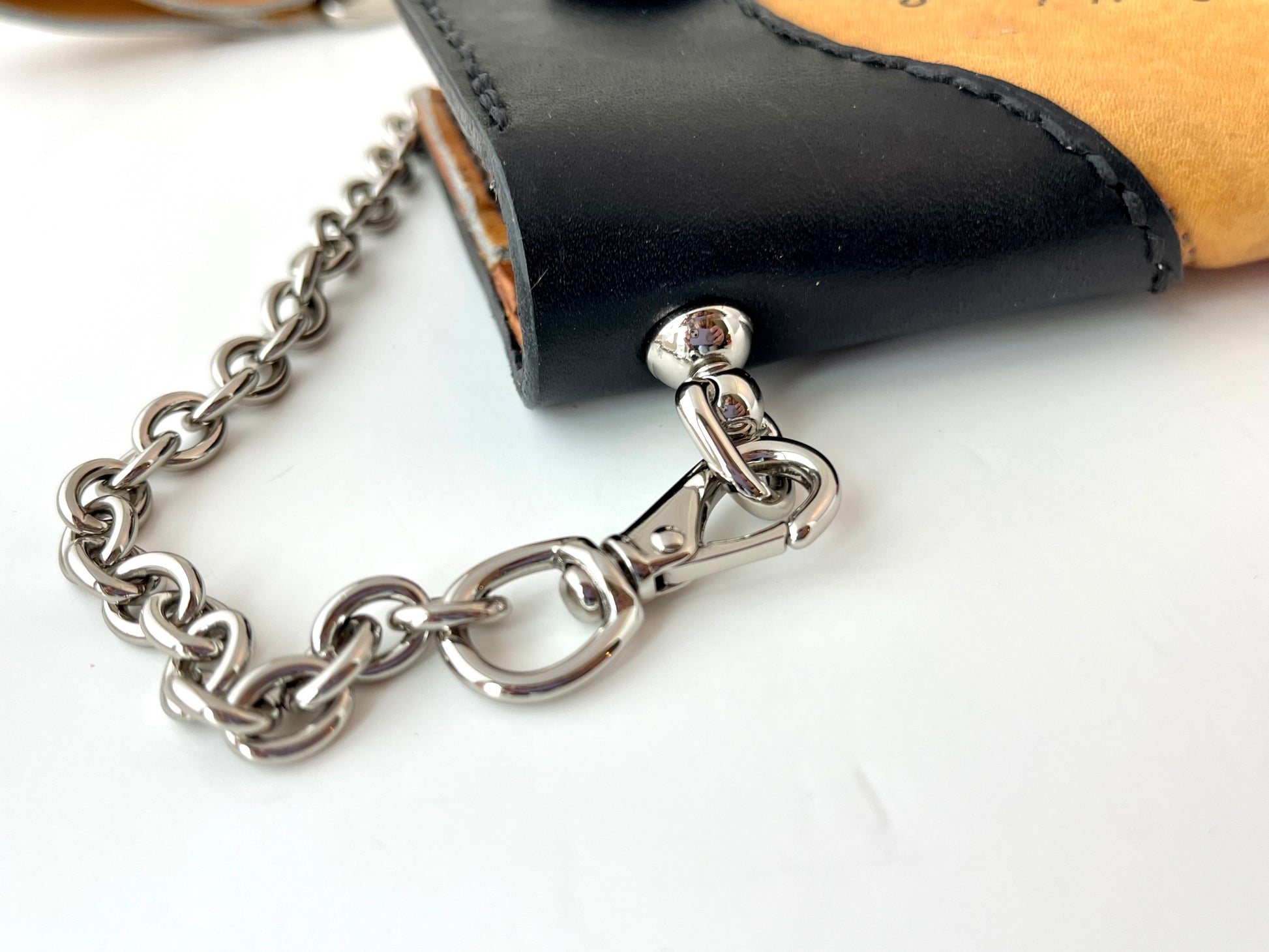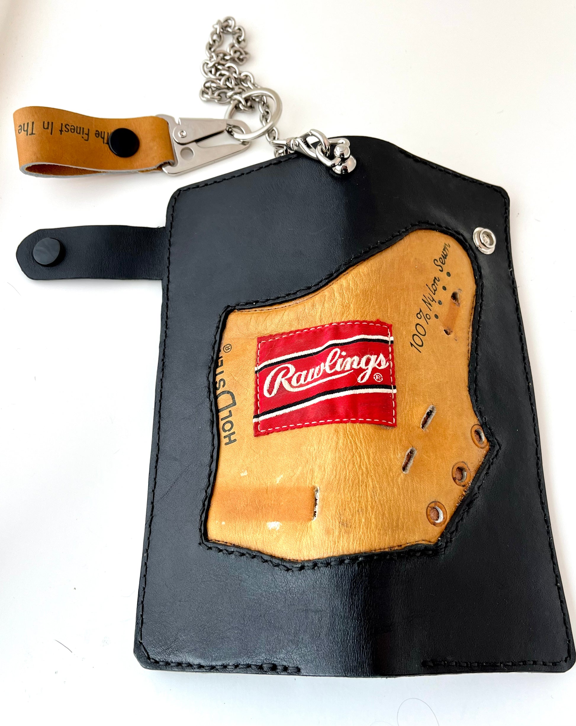 This one of a kind Trucker/Biker Long Wallet is made from pieces of a Rawlings catchers mitt blended with 100% full grain bridle and hand-dyed veg tan leather. It is a 7-pocket wallet with 2 bill pockets and 5 card pockets. The chain is a 12” nickel plated solid brass chain, which connects to the wallet with a swivel clip and to the belt with a belt loop sling clip keychain.