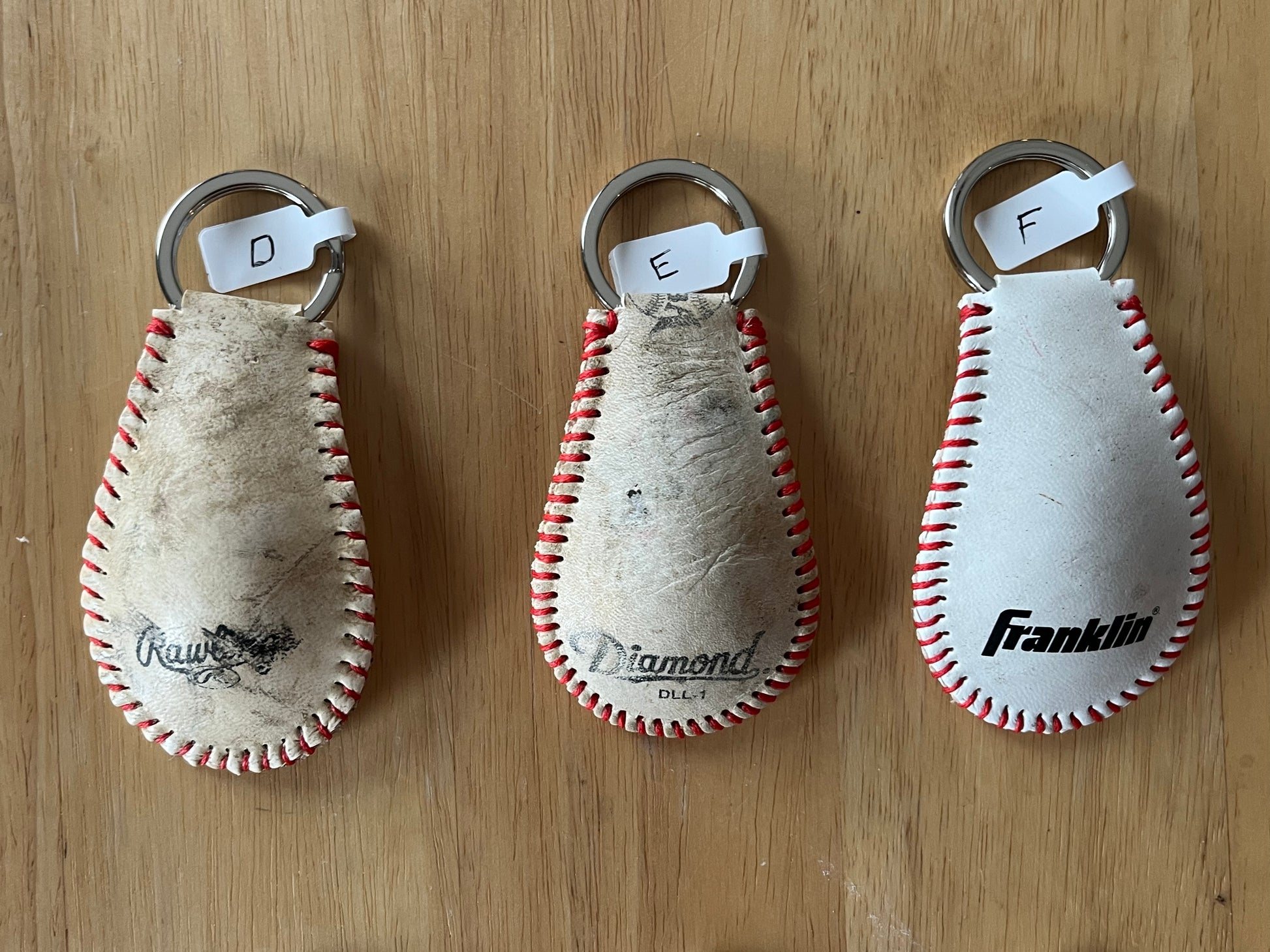 These keychains are made from old baseballs. They are a mix of leather or synthetic leather based on what the baseballs were covered with. Each keychain is made from the outer layer of a baseball that has been cut off along the seam and then re-stitched together.