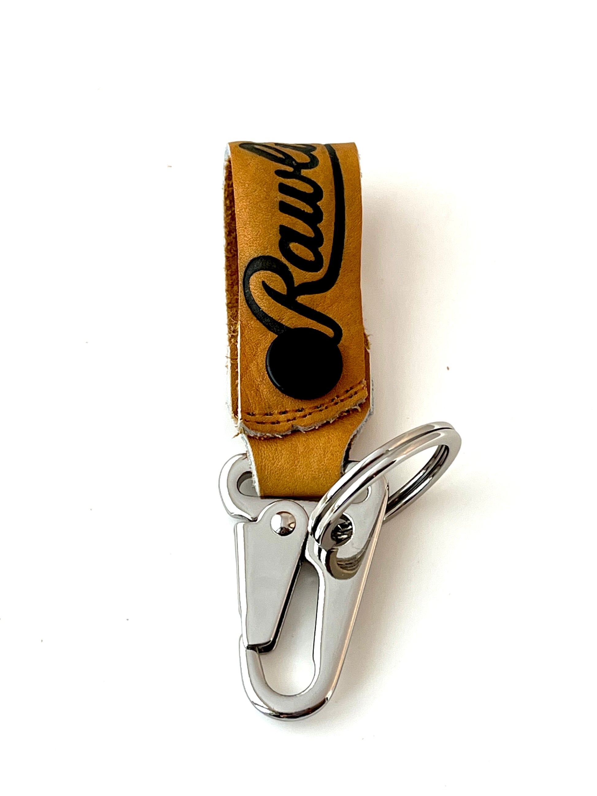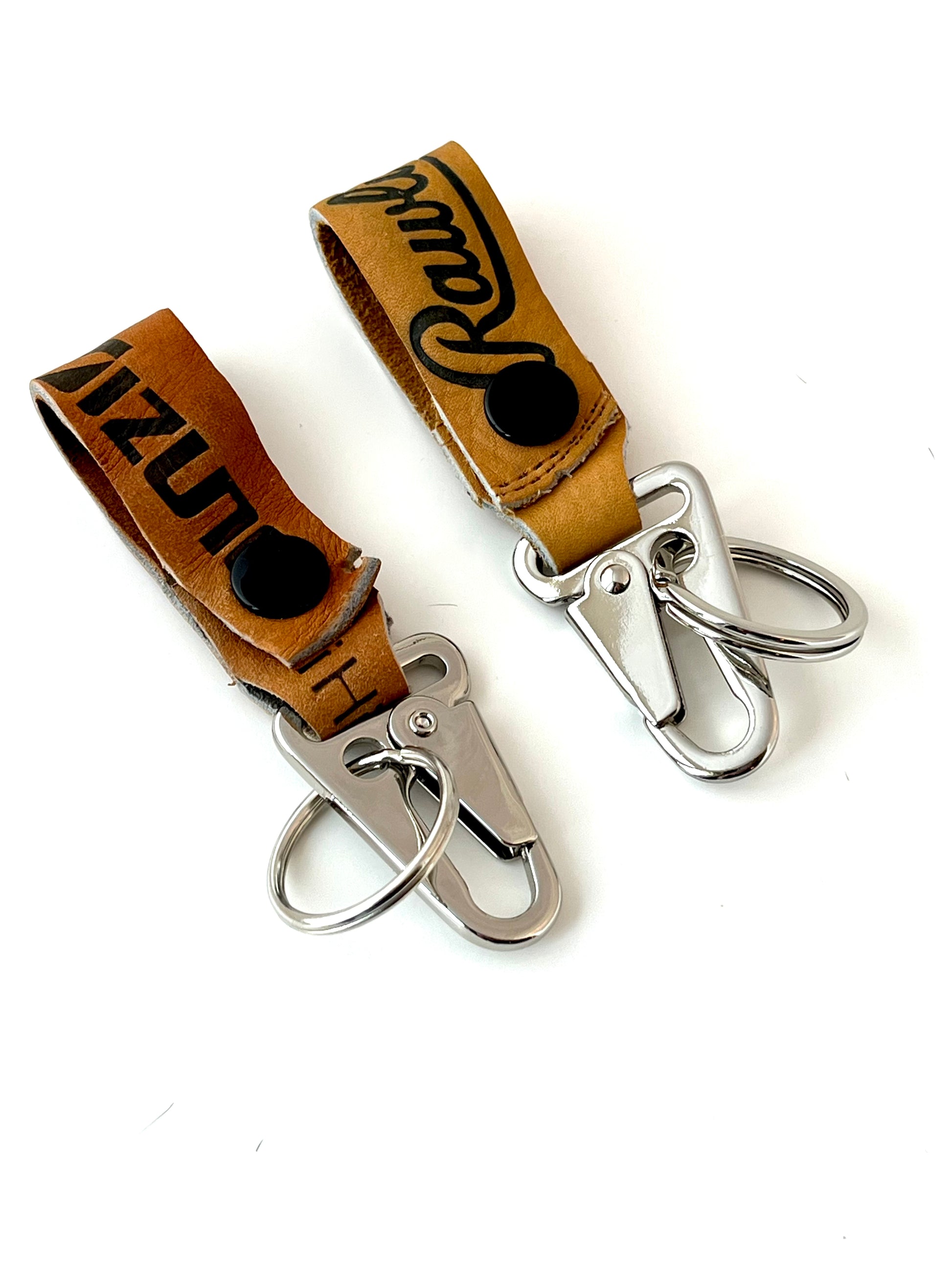 These keychains can be snapped around your belt to keep your pockets free of bulky keys. Each keychain is made from a salvaged baseball glove and has a sling clip with a round key ring on the end.