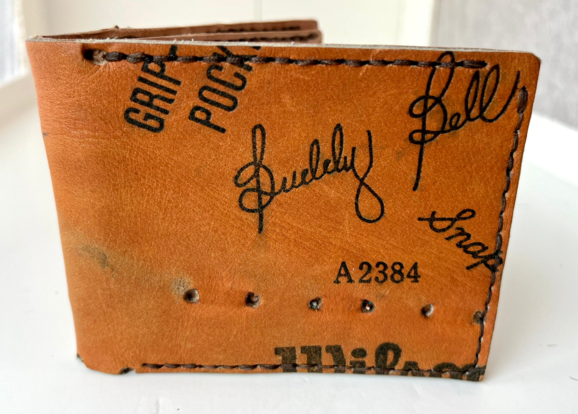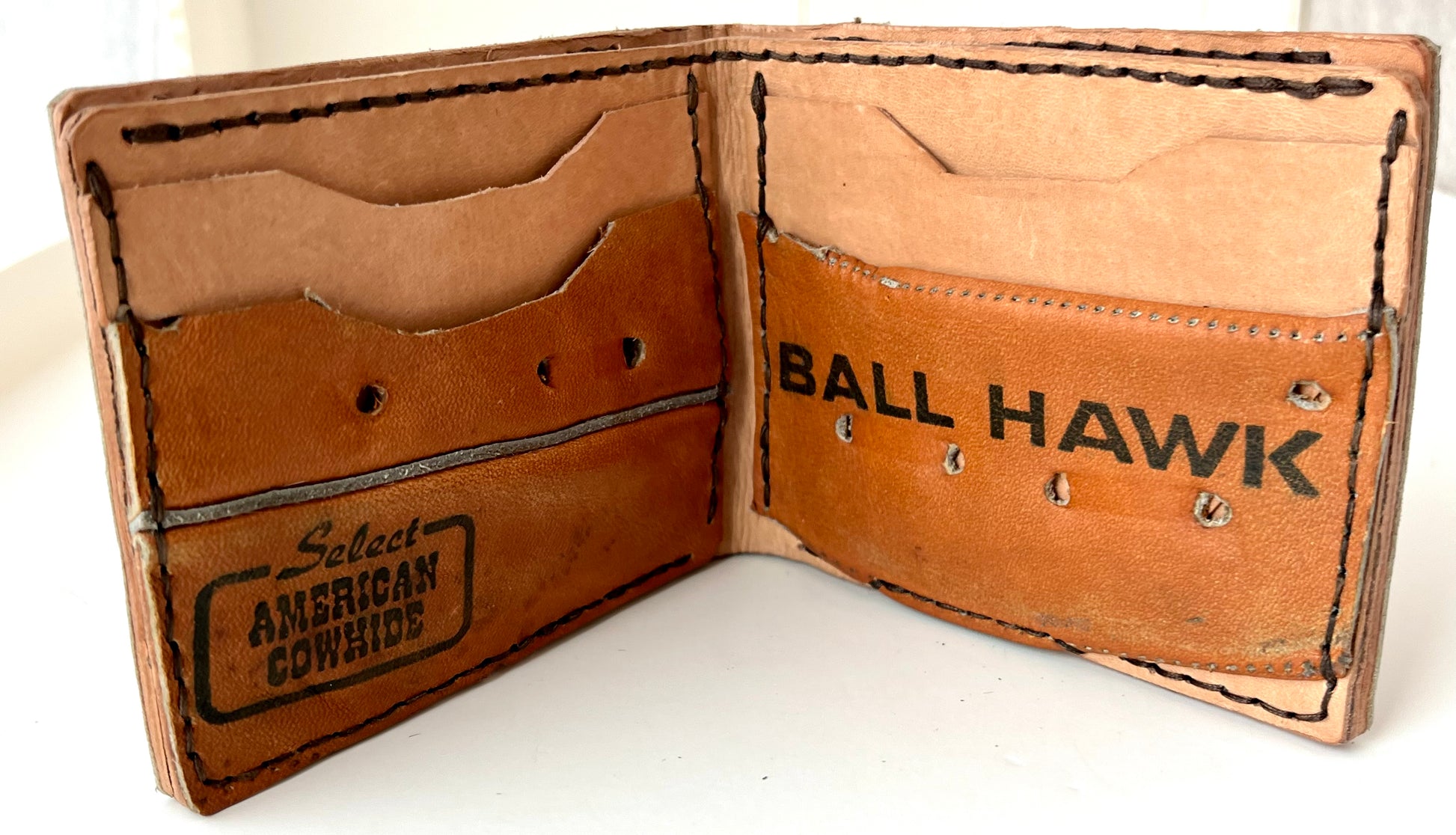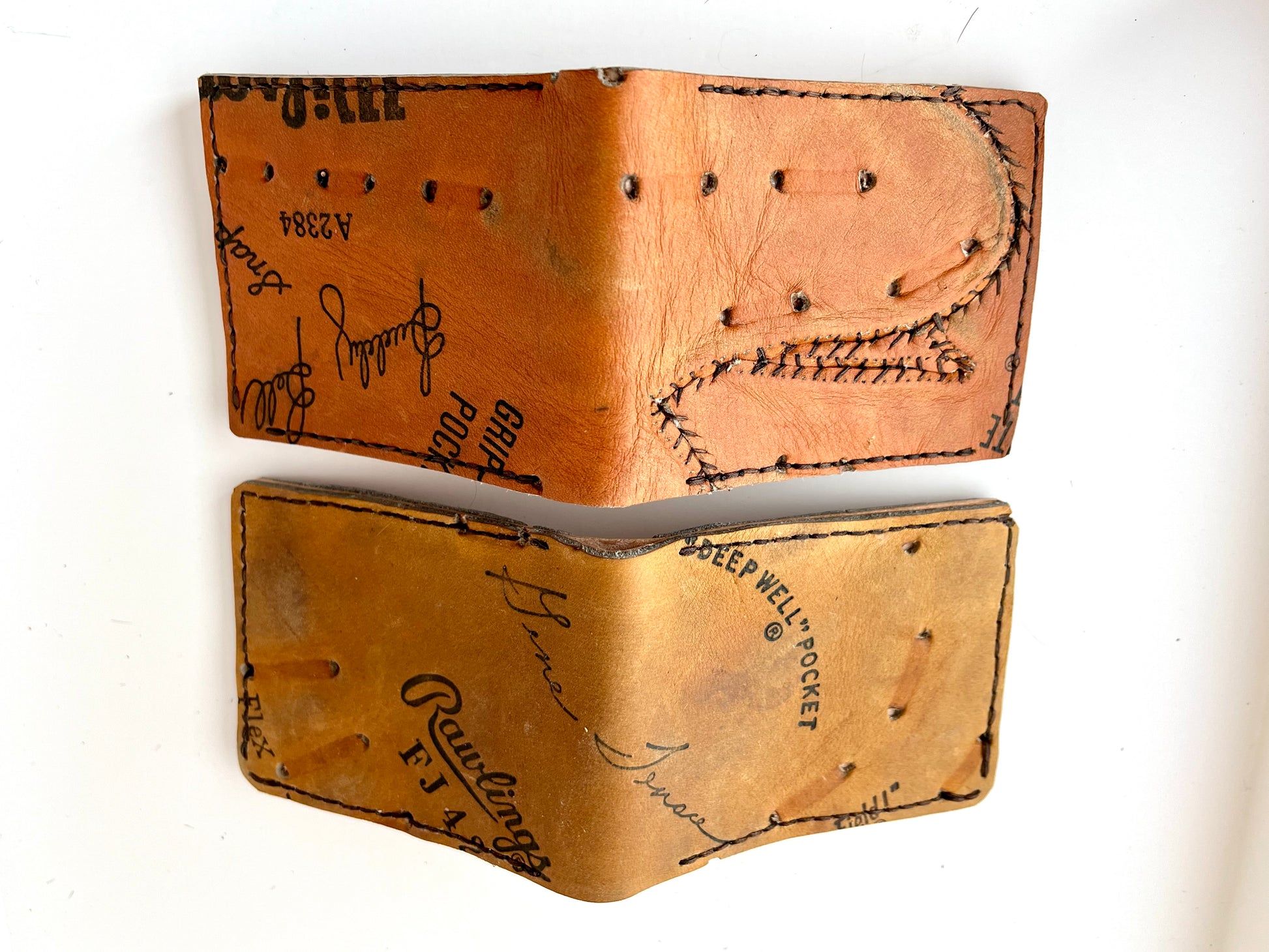 The Rawlings glove wallet is baseball glove leather mixed with a full grain natural veg tan and bridle tan leathers. It is a 5-pocket wallet, with a large bill pocket and 4 card pockets. The interior wall of the bill pocket is not lined giving it a slightly slimmer profile than the Wilson wallet.