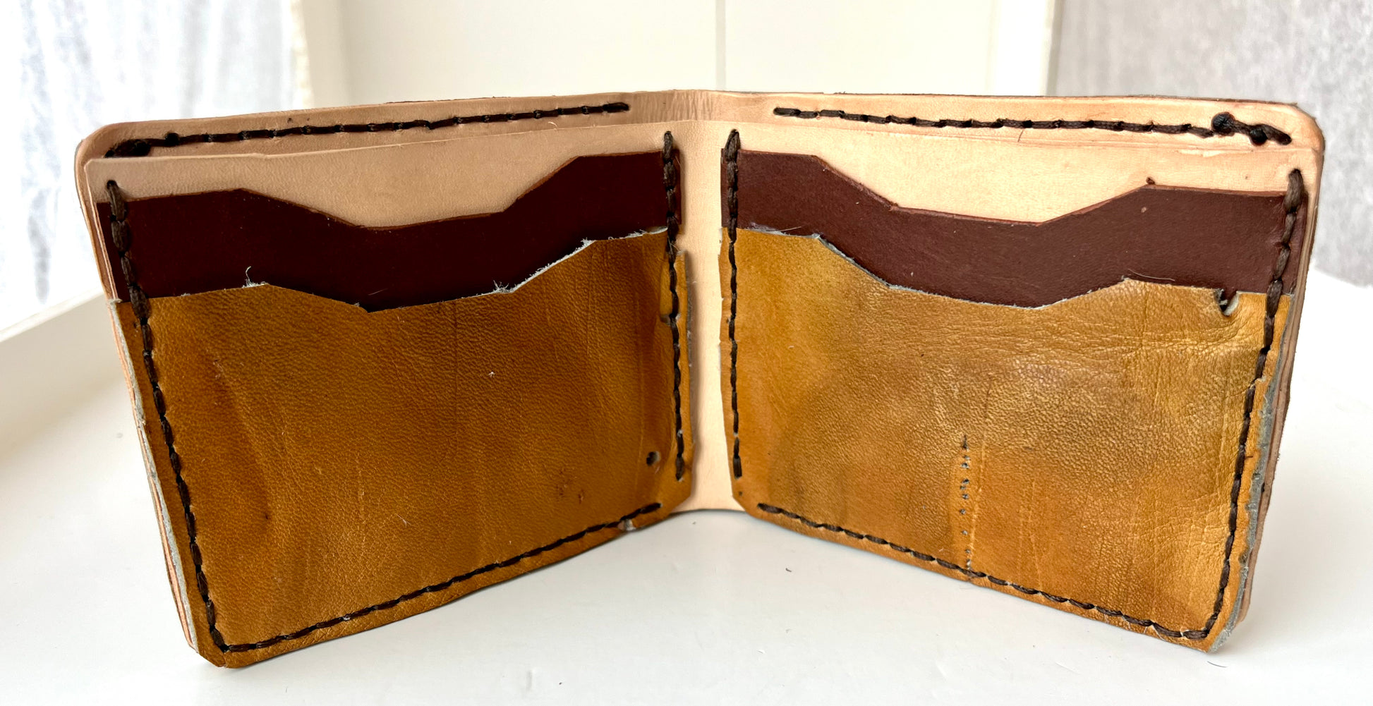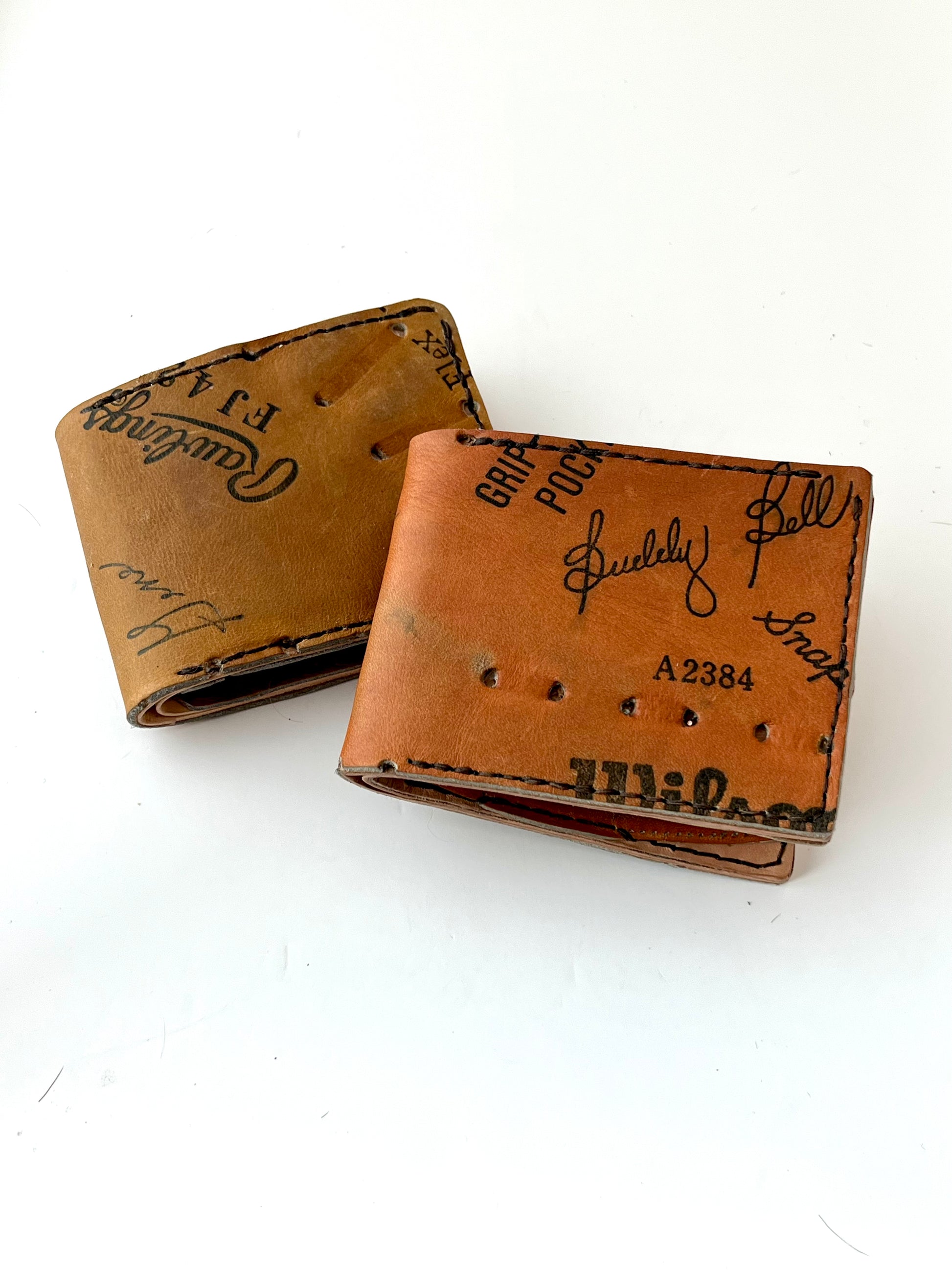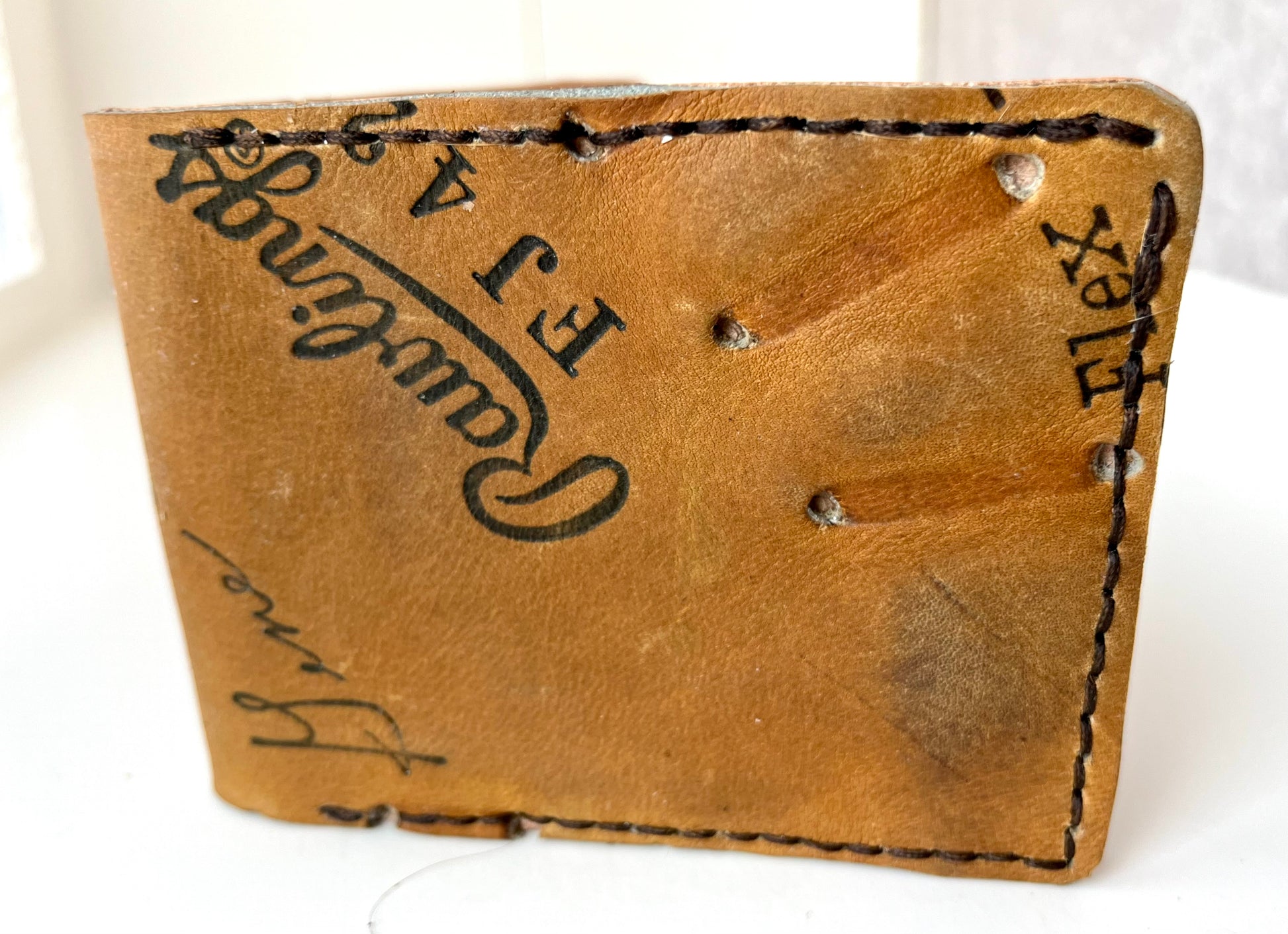 The Rawlings glove wallet is baseball glove leather mixed with a full grain natural veg tan and bridle tan leathers. It is a 5-pocket wallet, with a large bill pocket and 4 card pockets. The interior wall of the bill pocket is not lined giving it a slightly slimmer profile than the Wilson wallet.