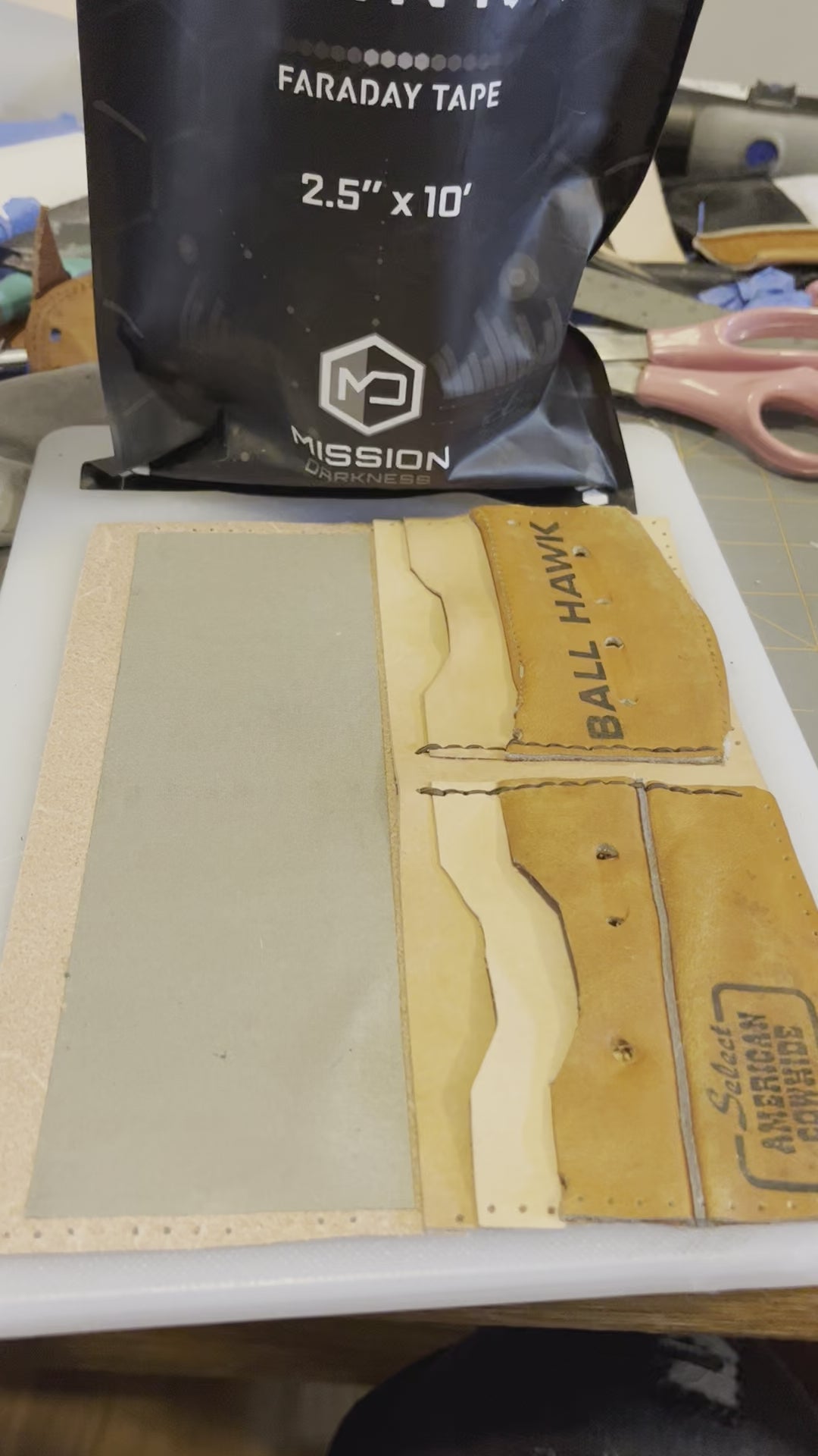 The Wilson Buddy Bell wallet is baseball glove leather mixed with a full grain natural veg tan leather. It is a 5-pocket wallet, with a large bill pocket and 4 card pockets. The interior wall of the bill pocket is lined with 2.5” high TitanRF Faraday Tape to add a layer of RF protection to your cards.