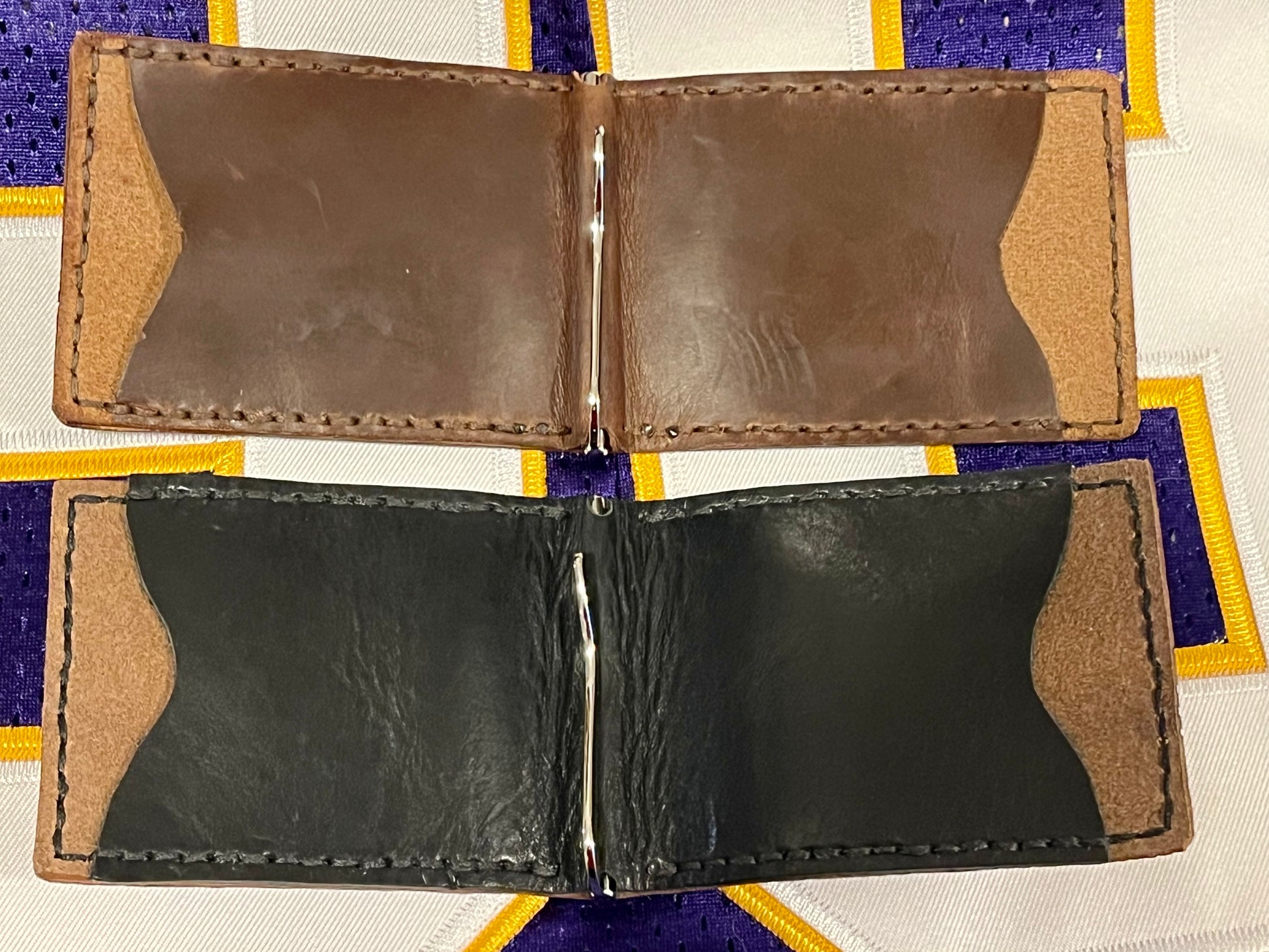 This handy wallets have 3 card pockets, 2 on the interior and one on the front. The interior pockets are genuine Horween leather and the rest of the wallet has been made from vintage football leather. They also have a spring loaded money clip on the inside to hold your cash!