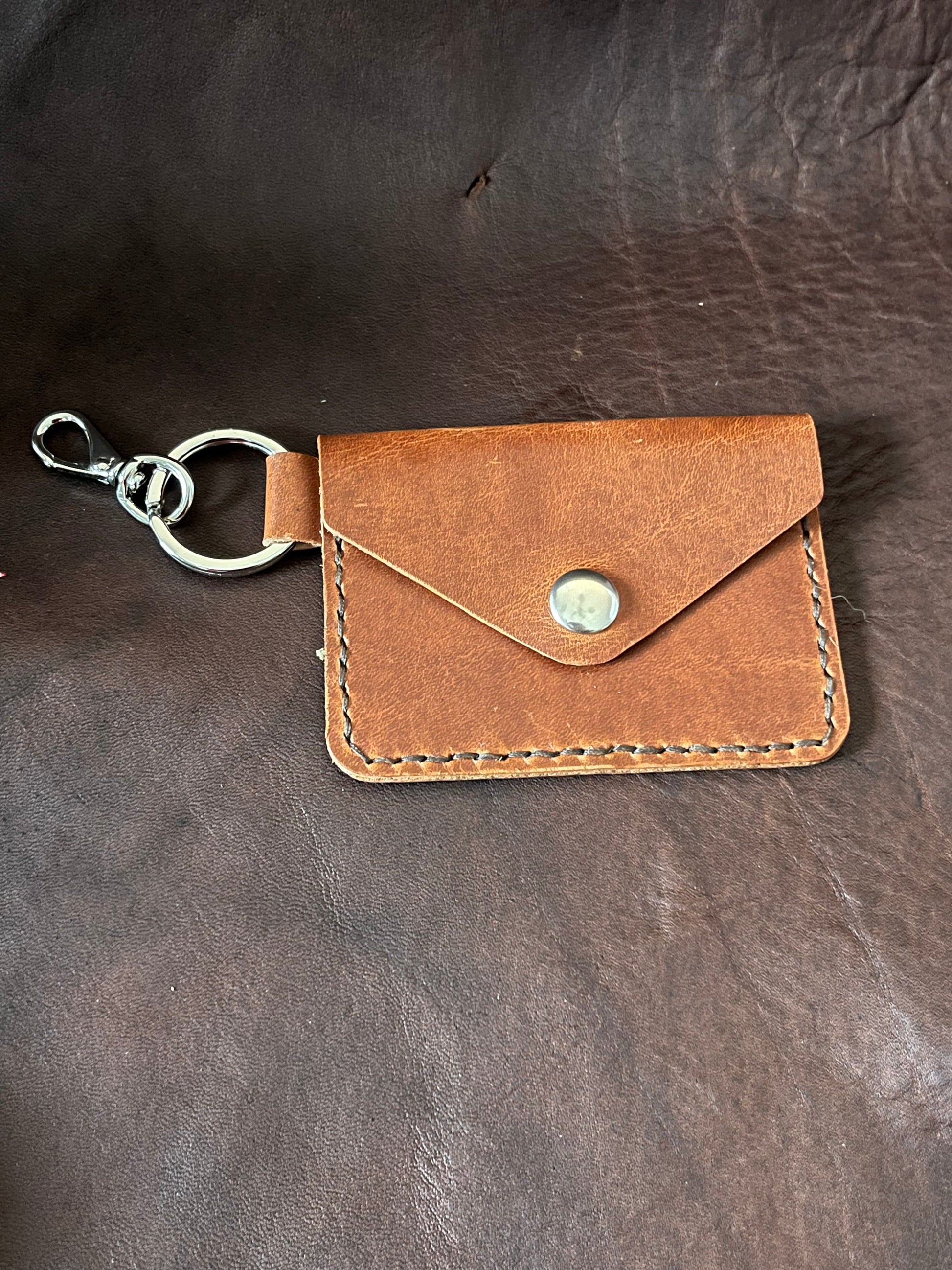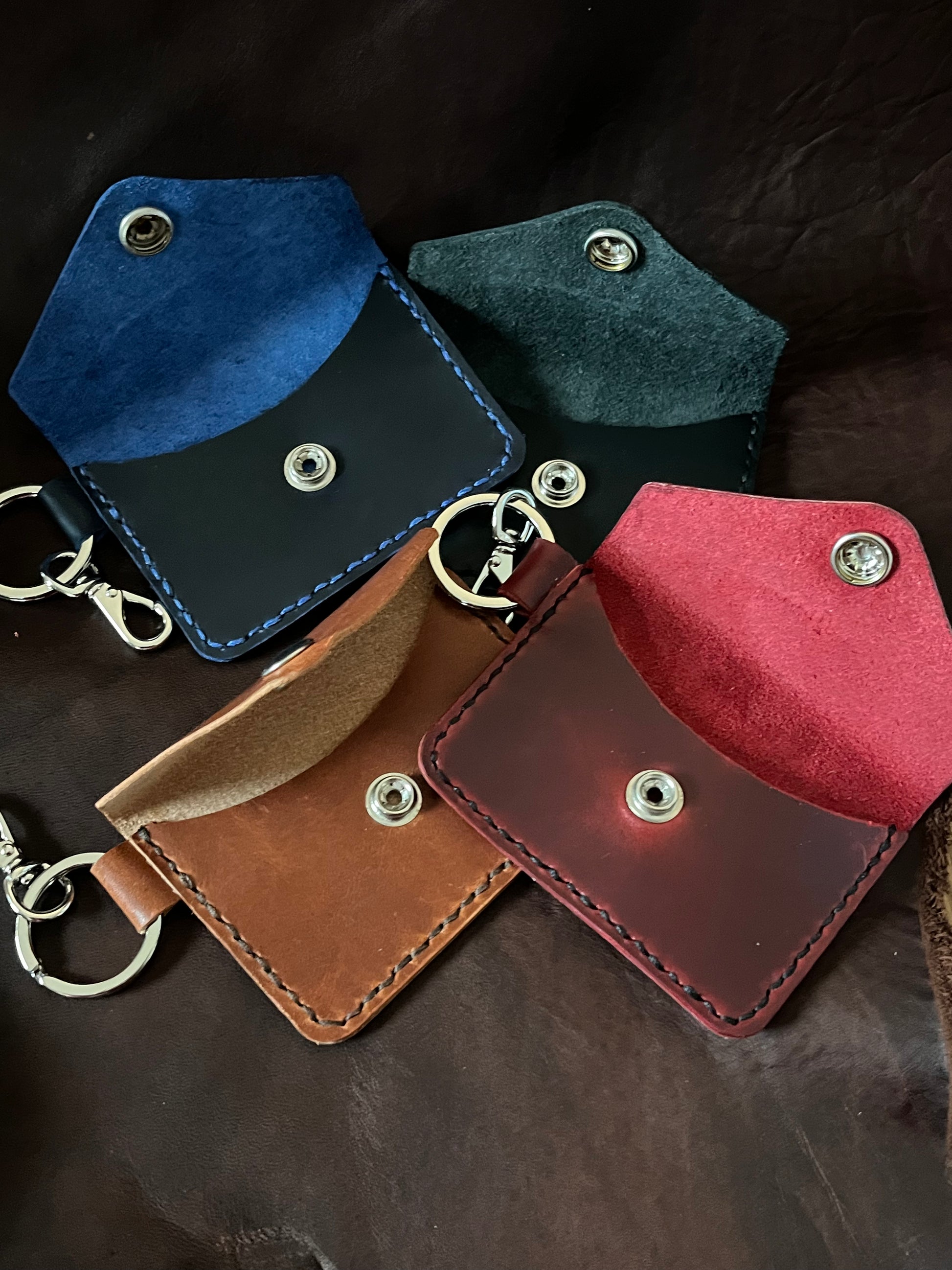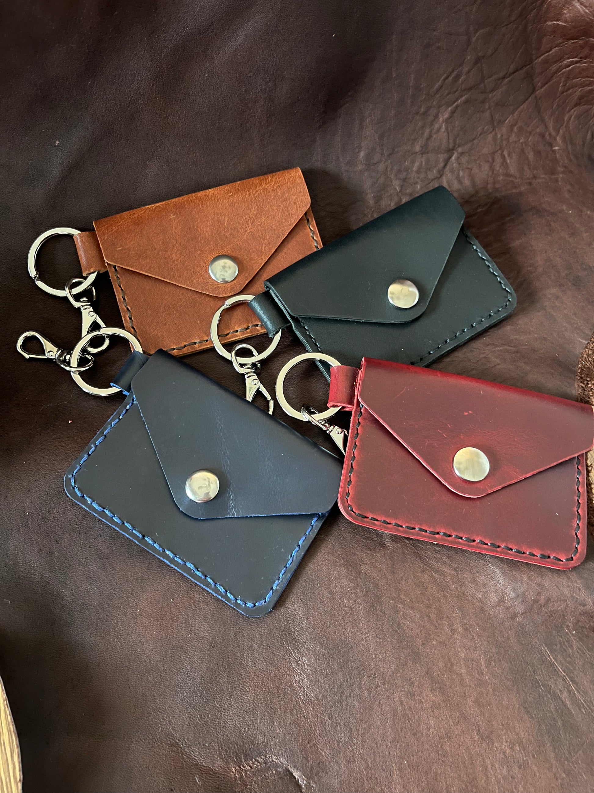 This little leather keychain wallet can keep your most used cards and a little cash always within reach! It has both a clip and a keyring so you can attach it inside a purse, to a lanyard, or just put it a pocket!