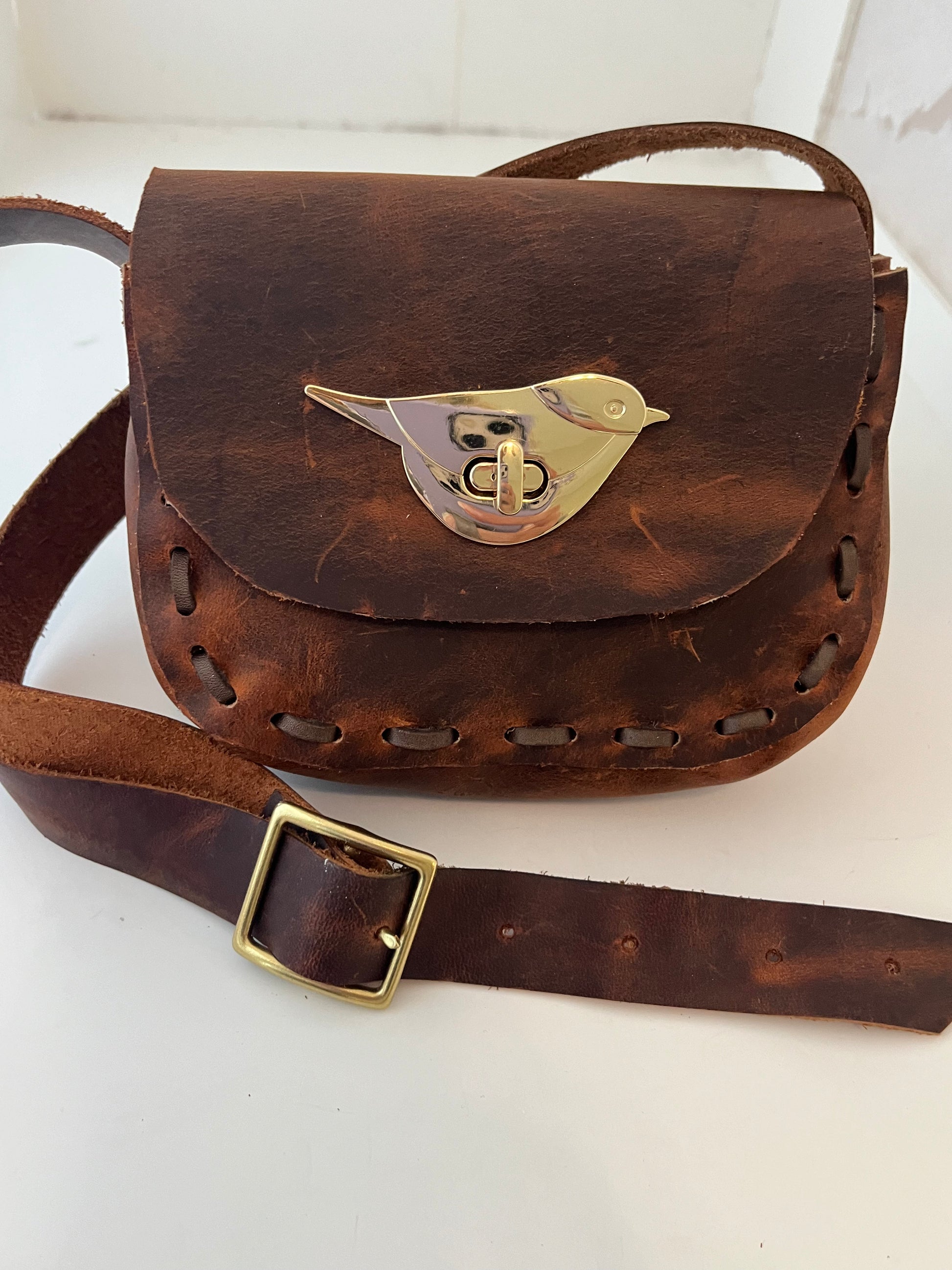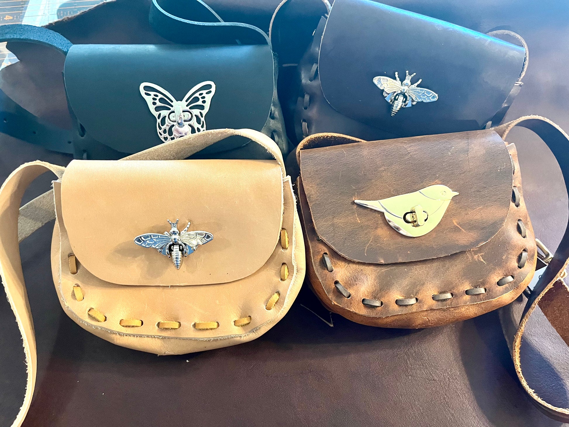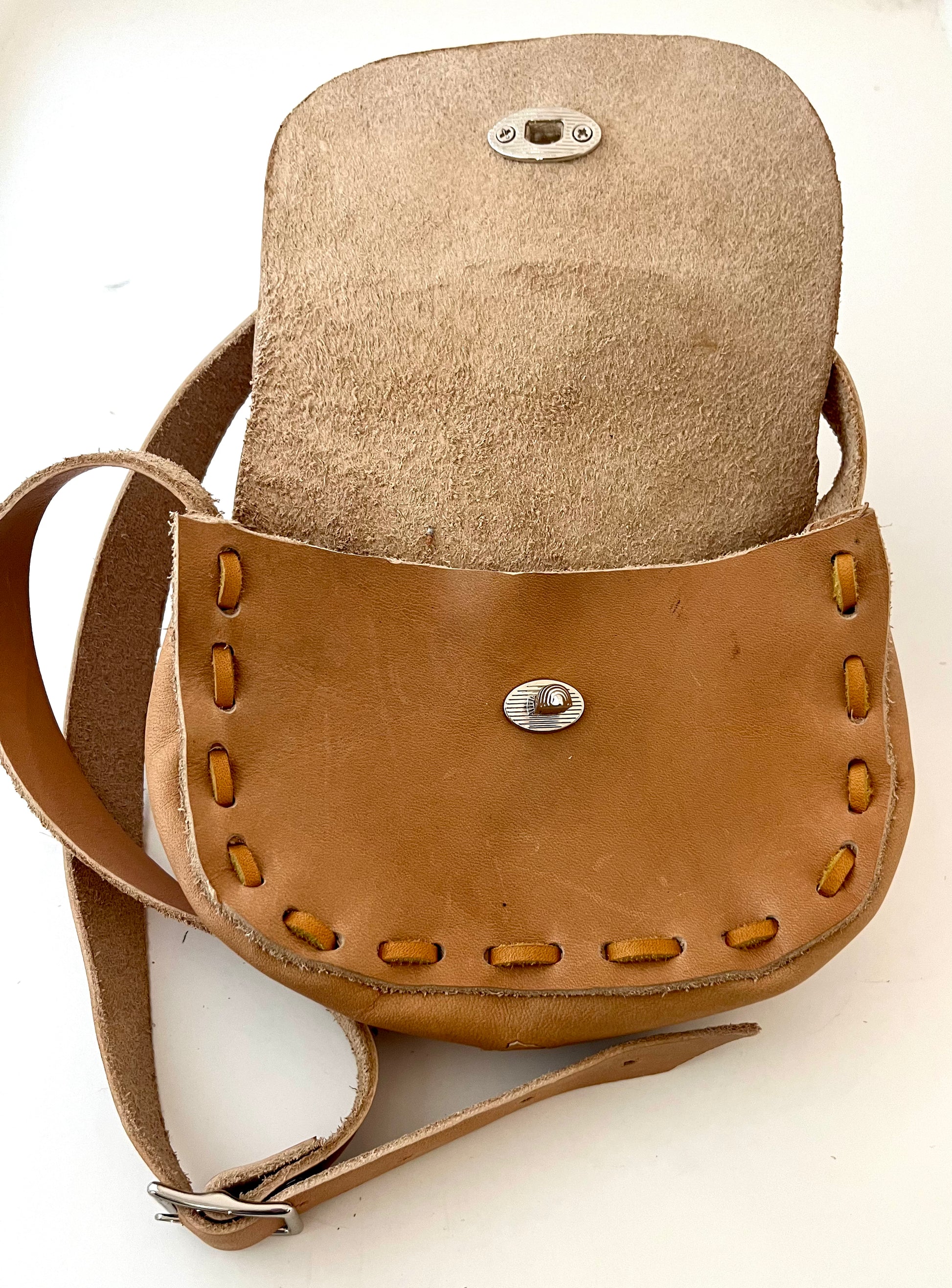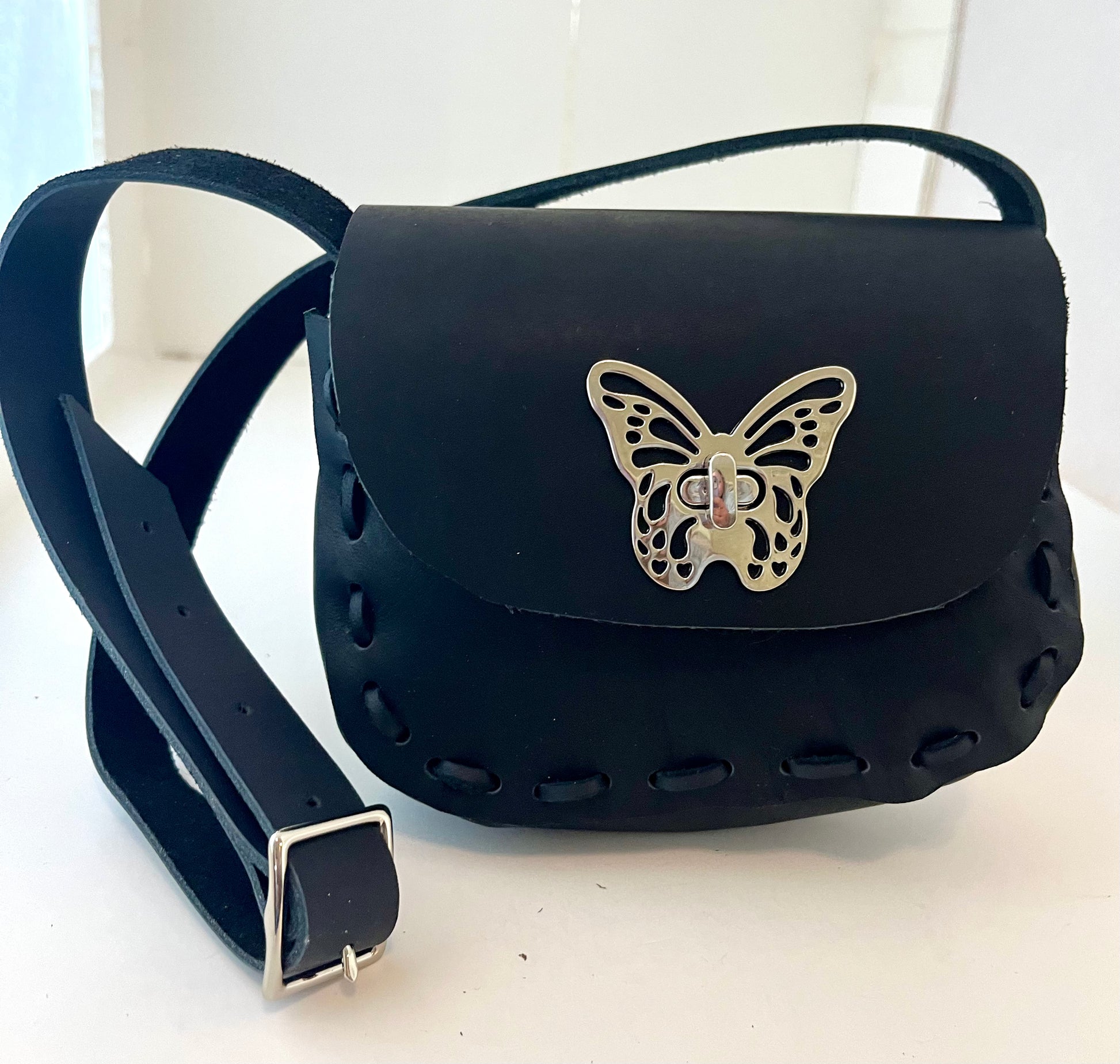 Inspired by a little purse I was gifted as a kid, these mini bags are cut, punched, and laced to create cute little bag. Perfect kid crossbody or adult shoulder bag. Bag measures approximately 5” high by 6” wide. Strap length is approximately 25-28”. Straps are attached with a simple rivet.
