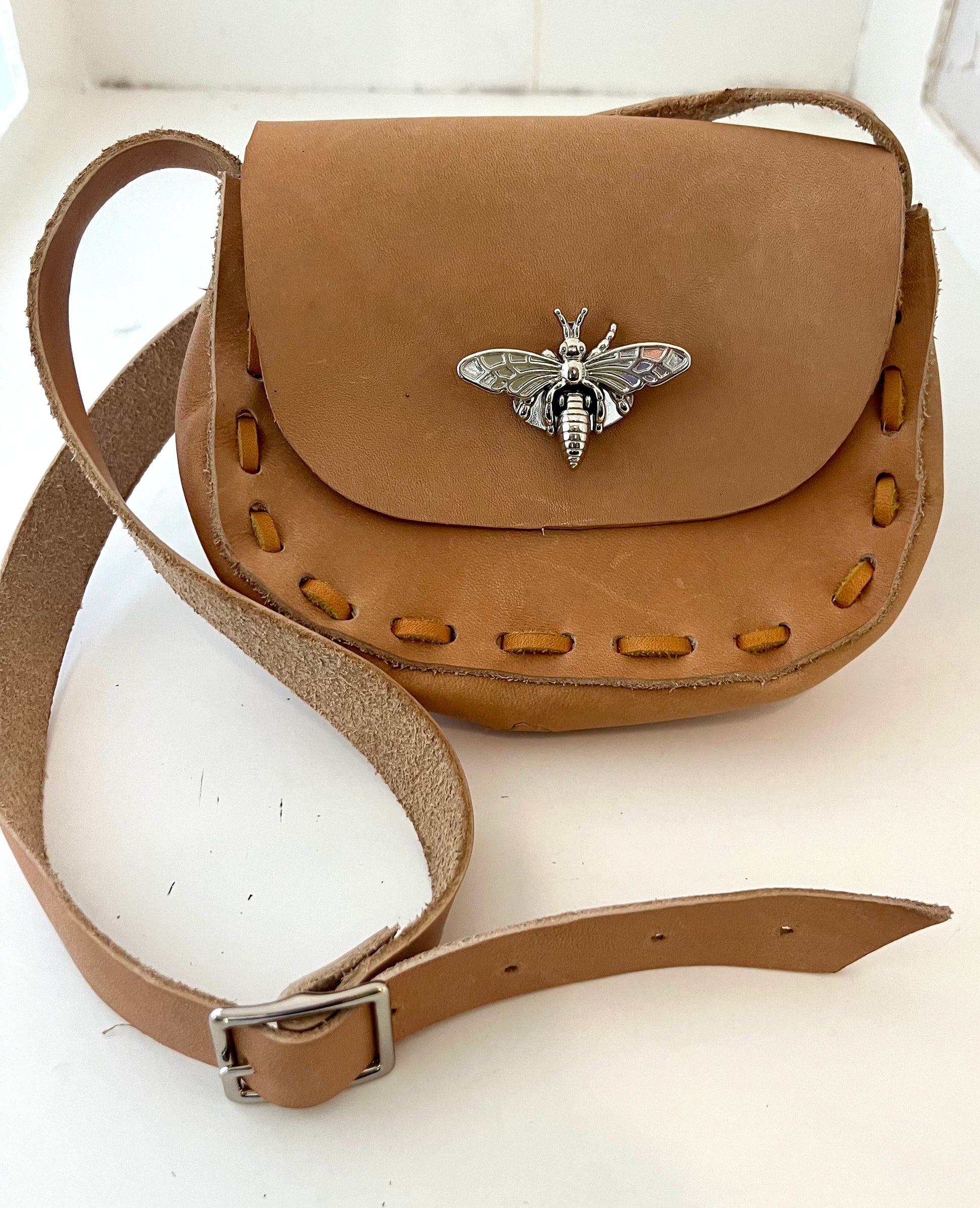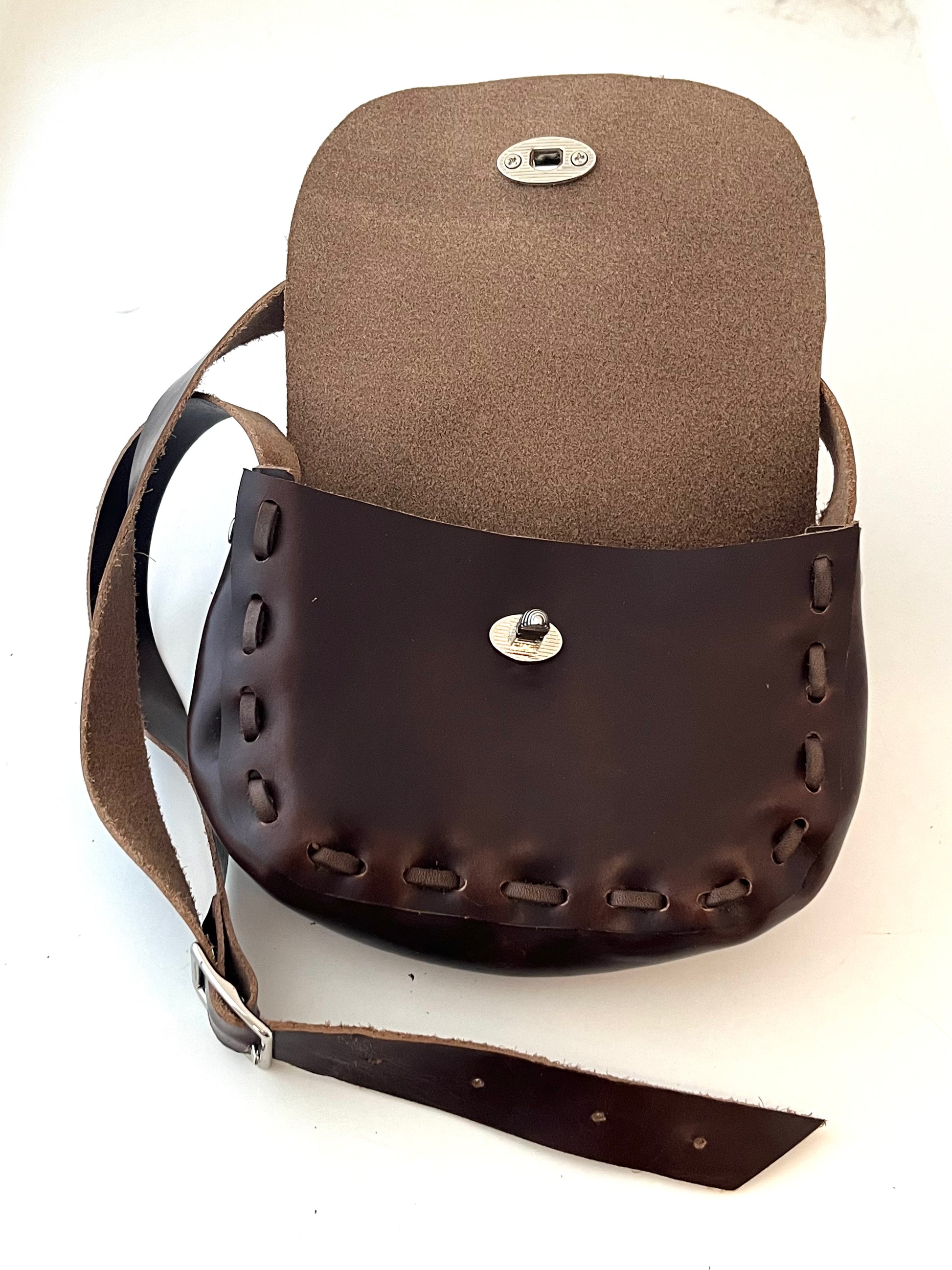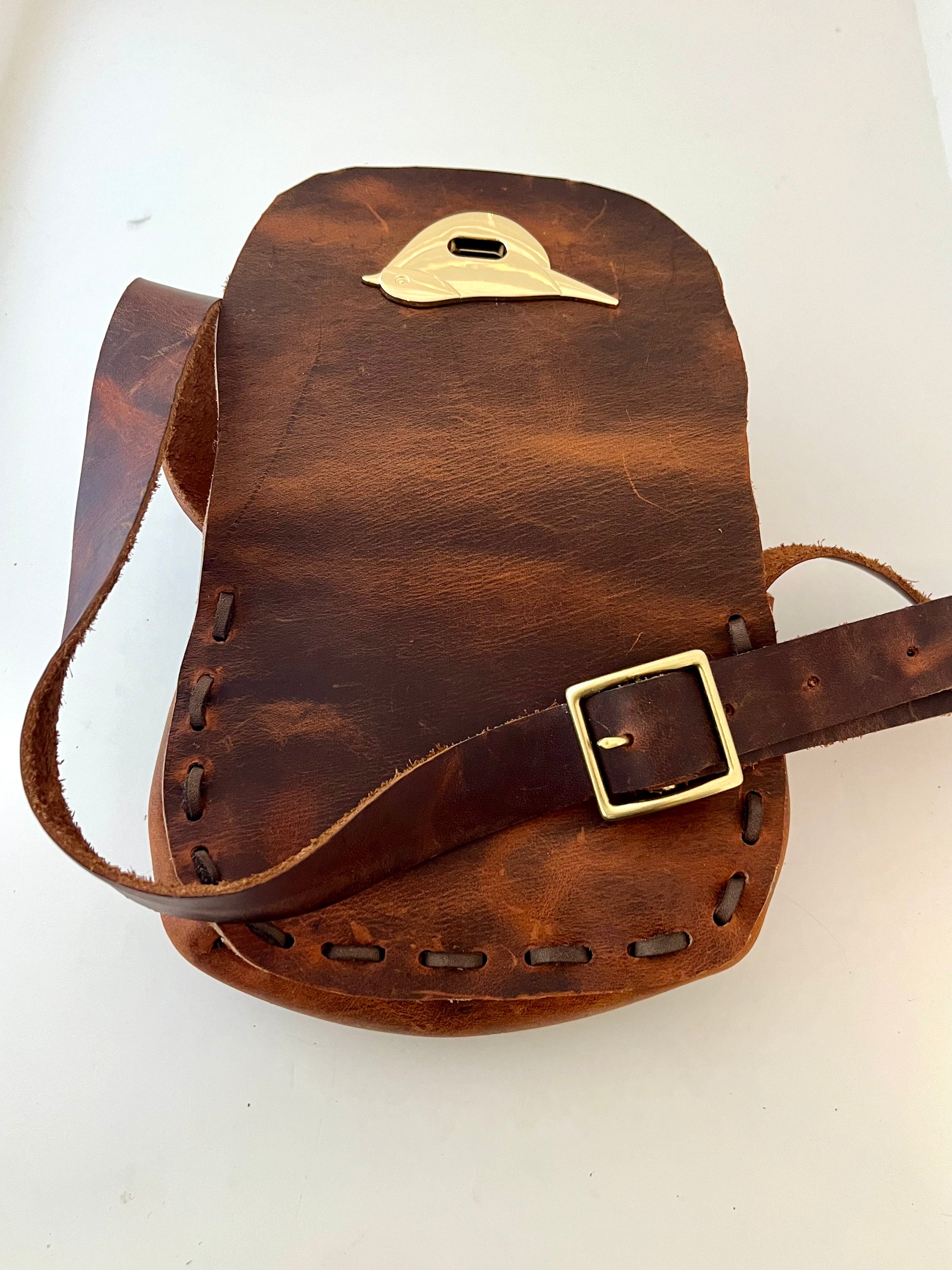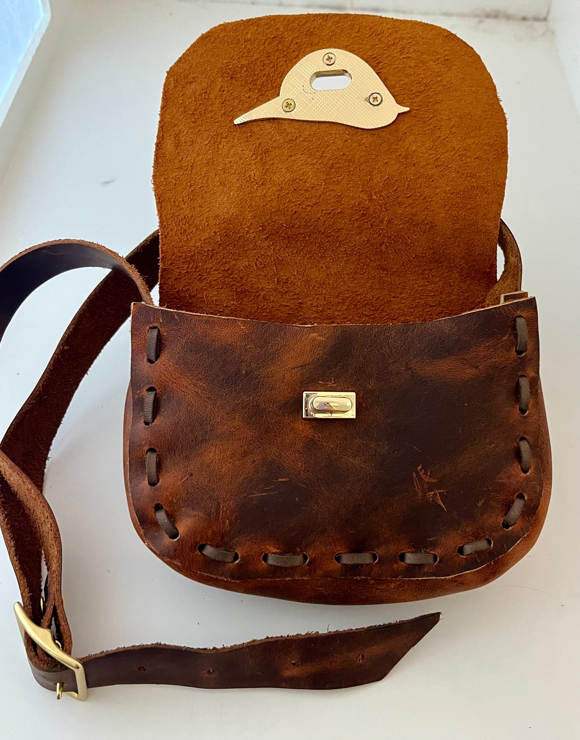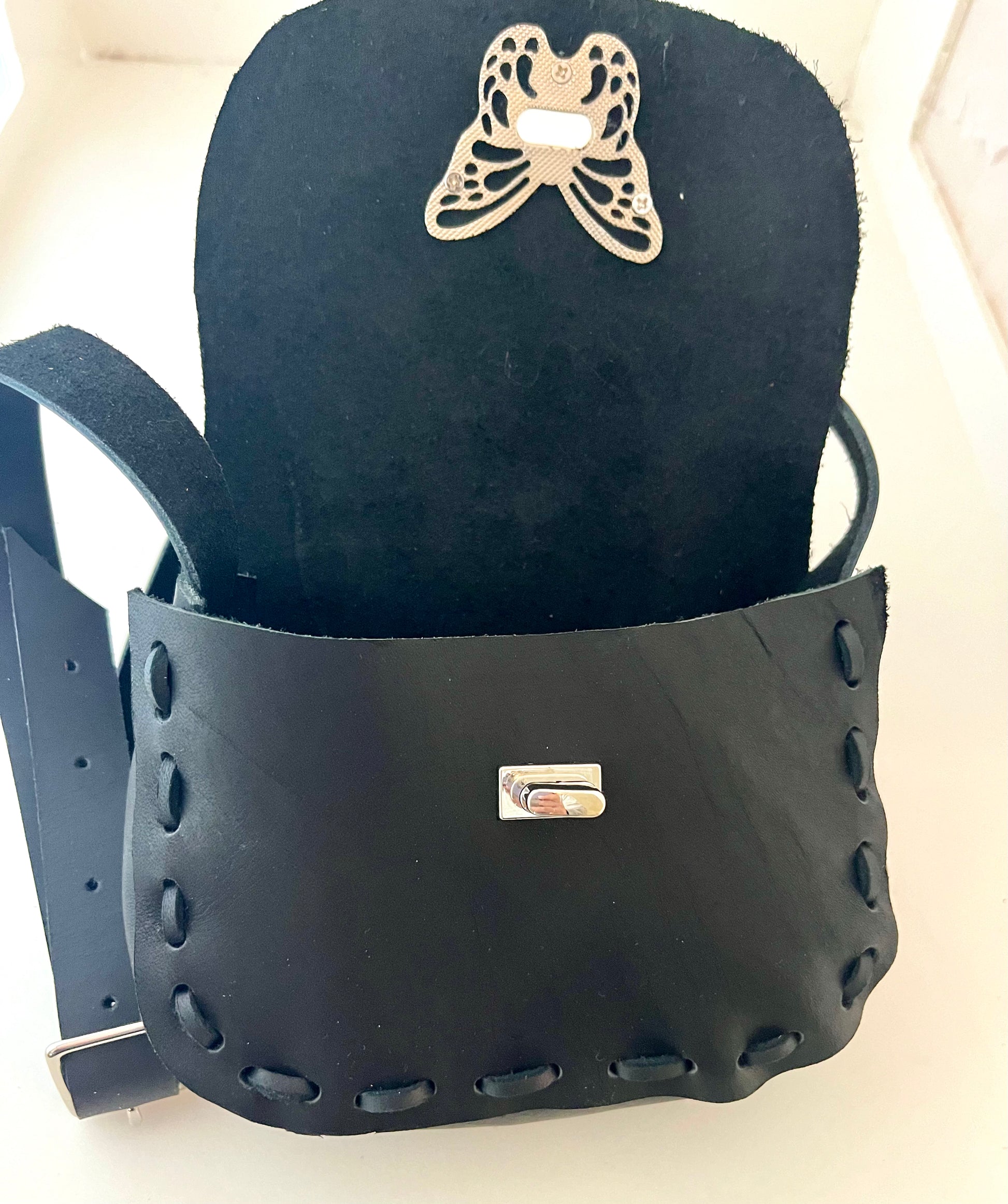 Inspired by a little purse I was gifted as a kid, these mini bags are cut, punched, and laced to create cute little bag. Perfect kid crossbody or adult shoulder bag. Bag measures approximately 5” high by 6” wide. Strap length is approximately 25-28”. Straps are attached with a simple rivet.