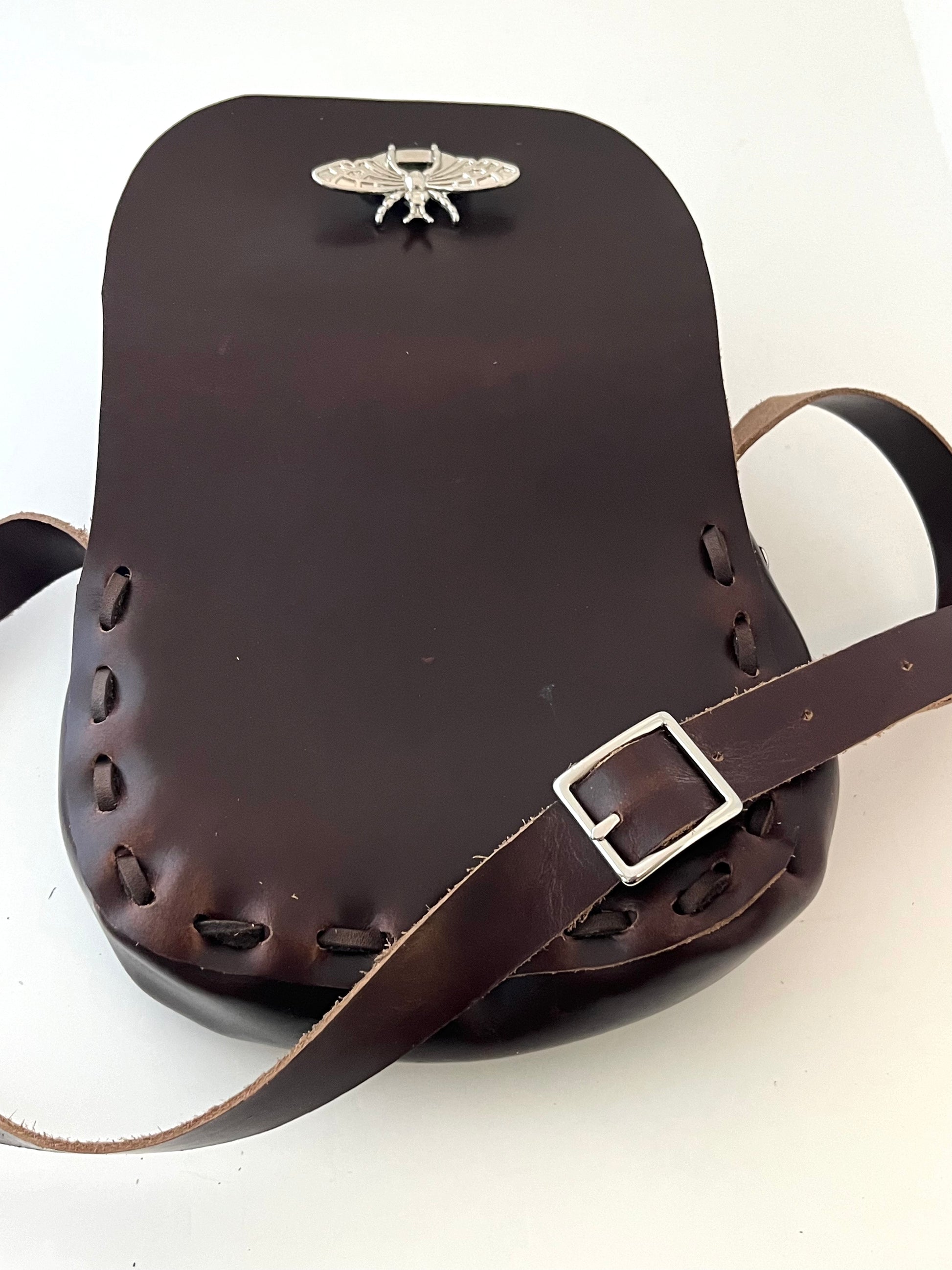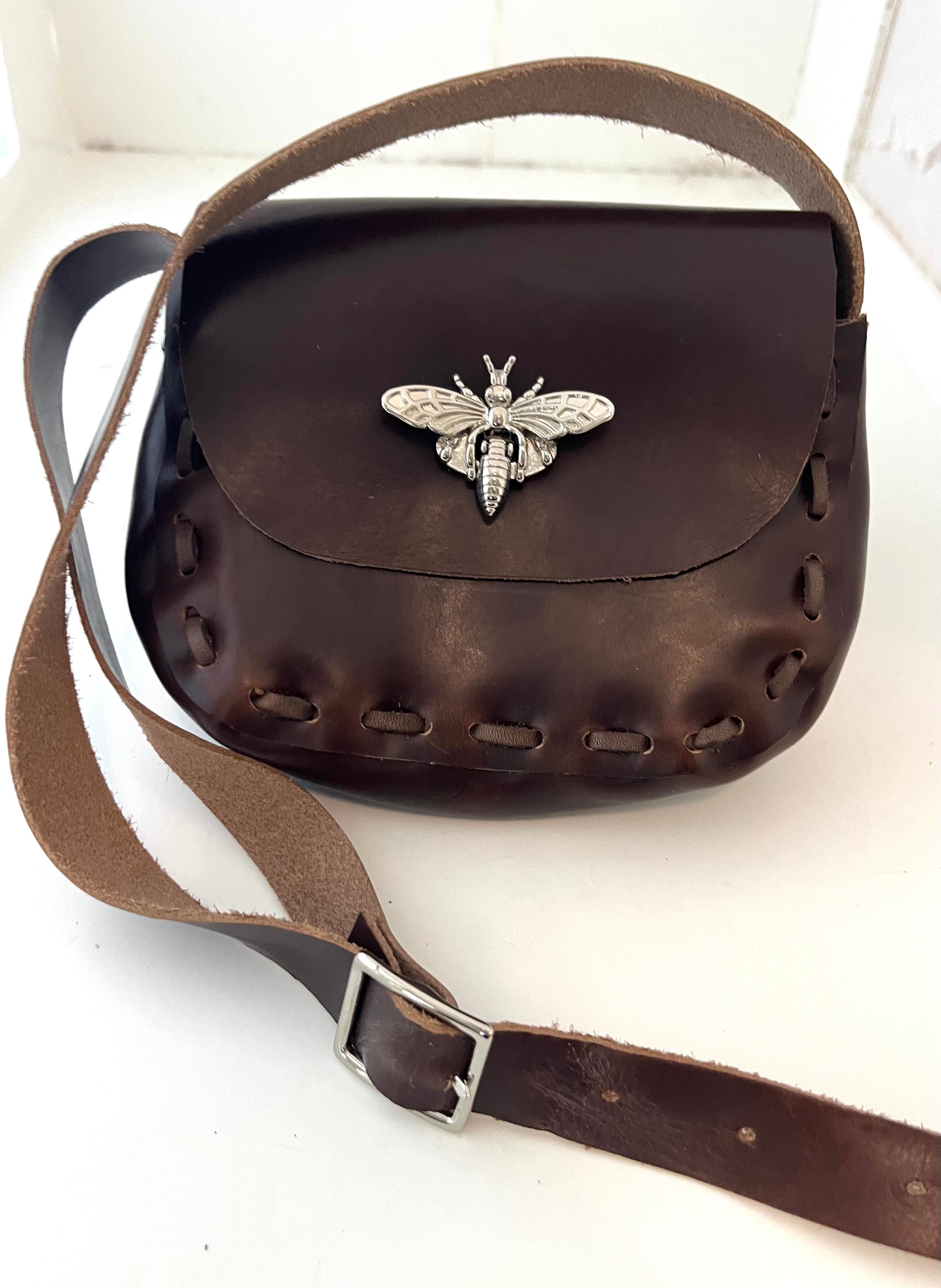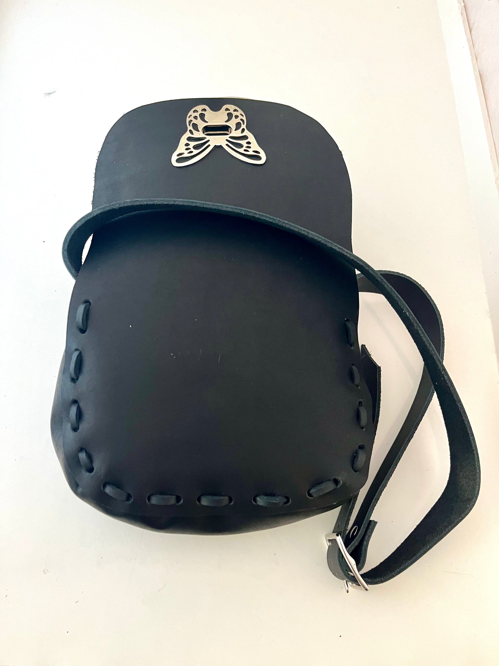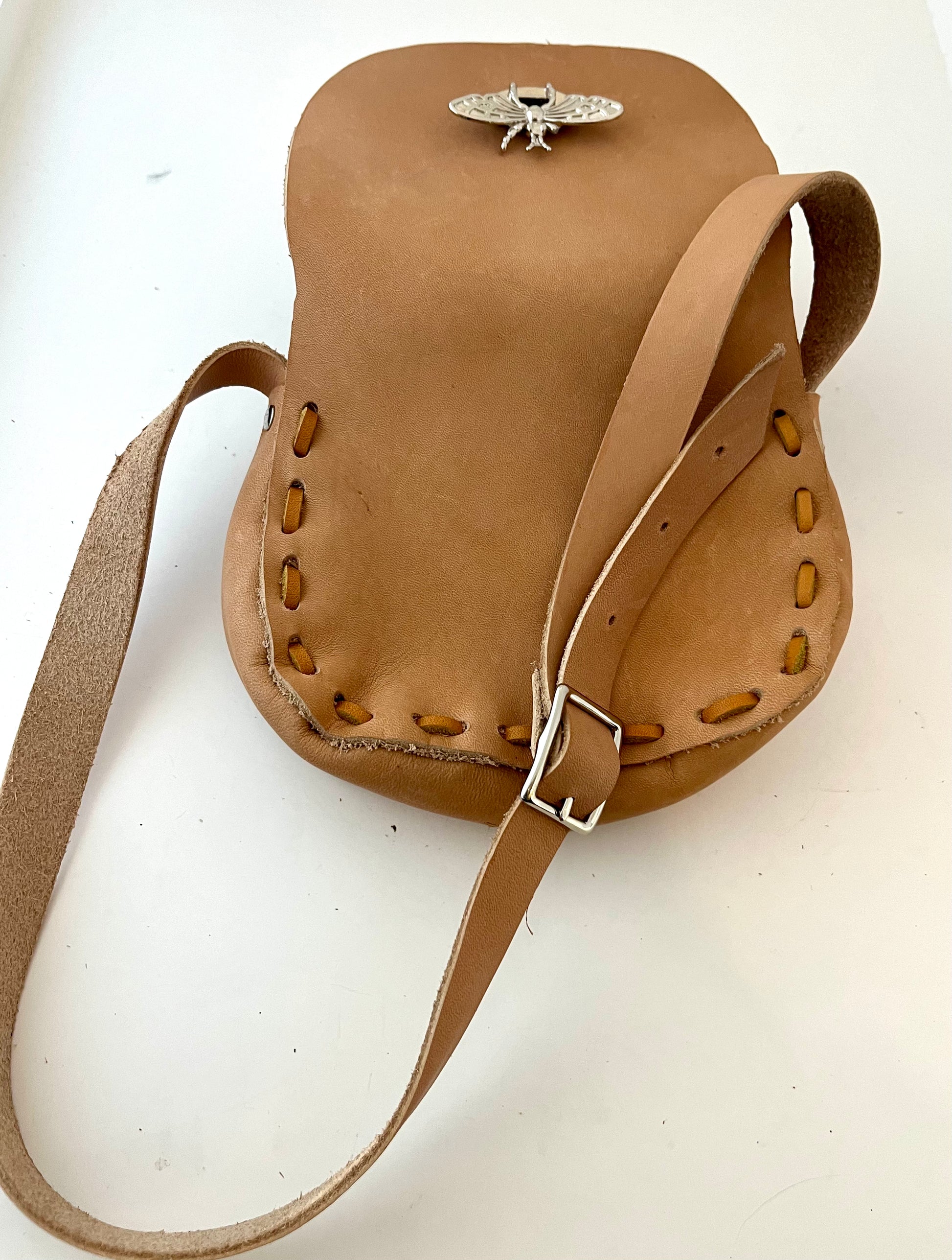Inspired by a little purse I was gifted as a kid, these mini bags are cut, punched, and laced to create cute little bag. Perfect kid crossbody or adult shoulder bag. Bag measures approximately 5” high by 6” wide. Strap length is approximately 25-28”. Straps are attached with a simple rivet.