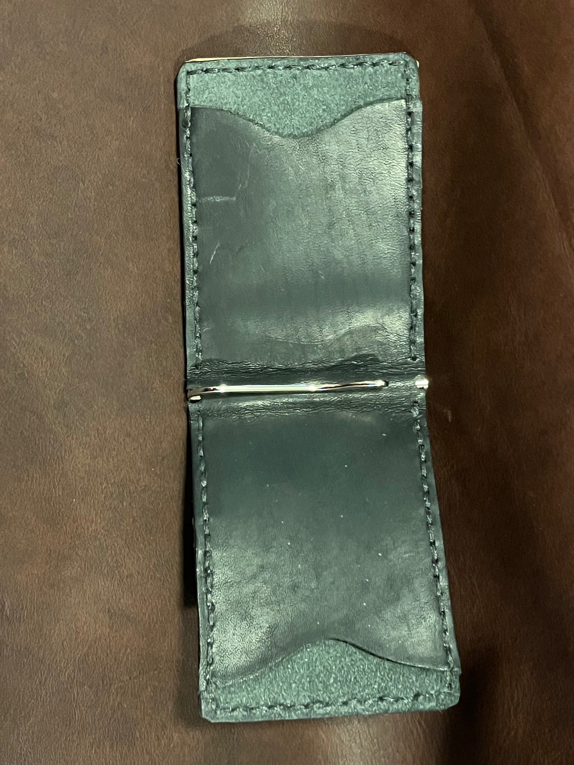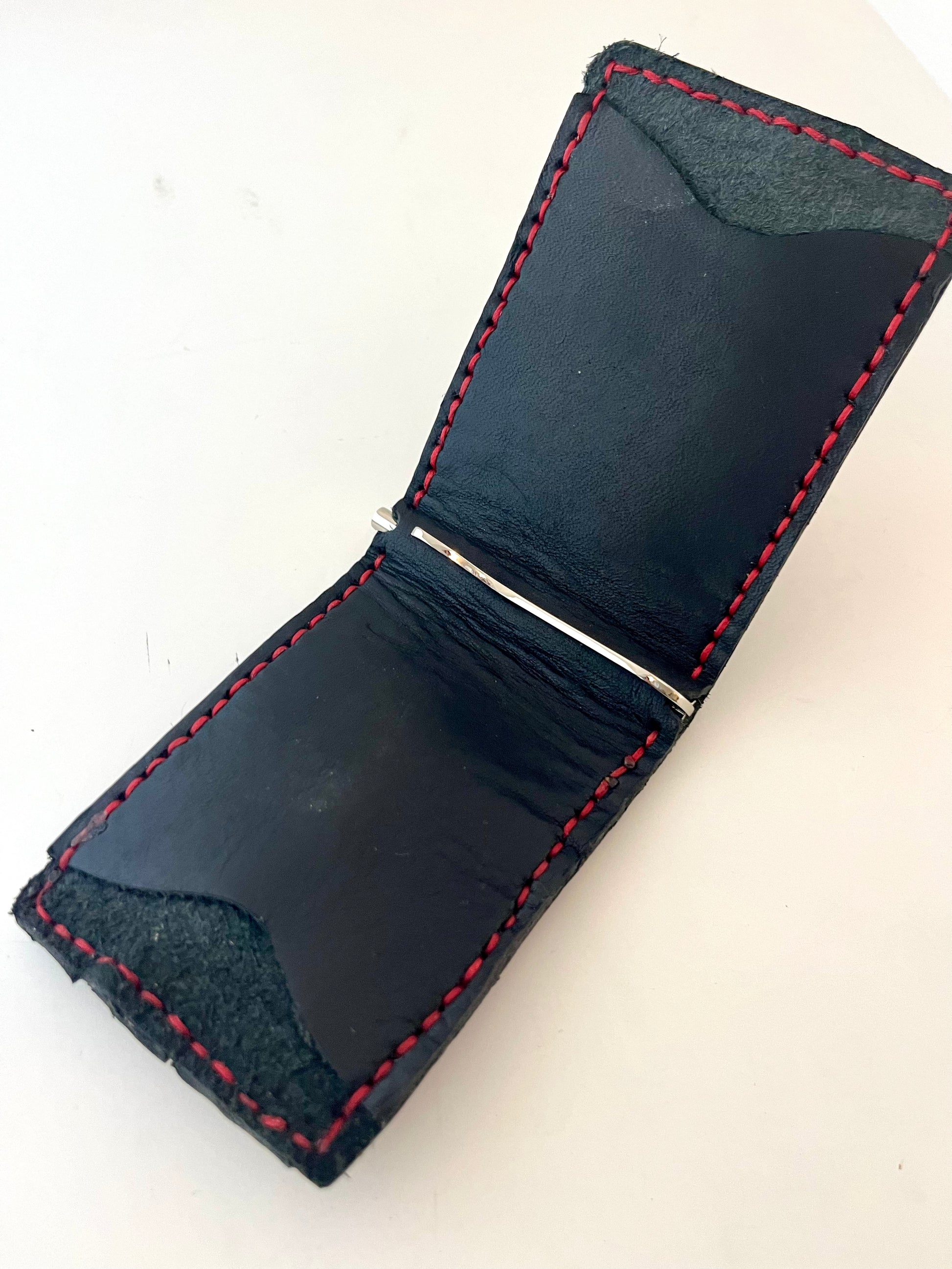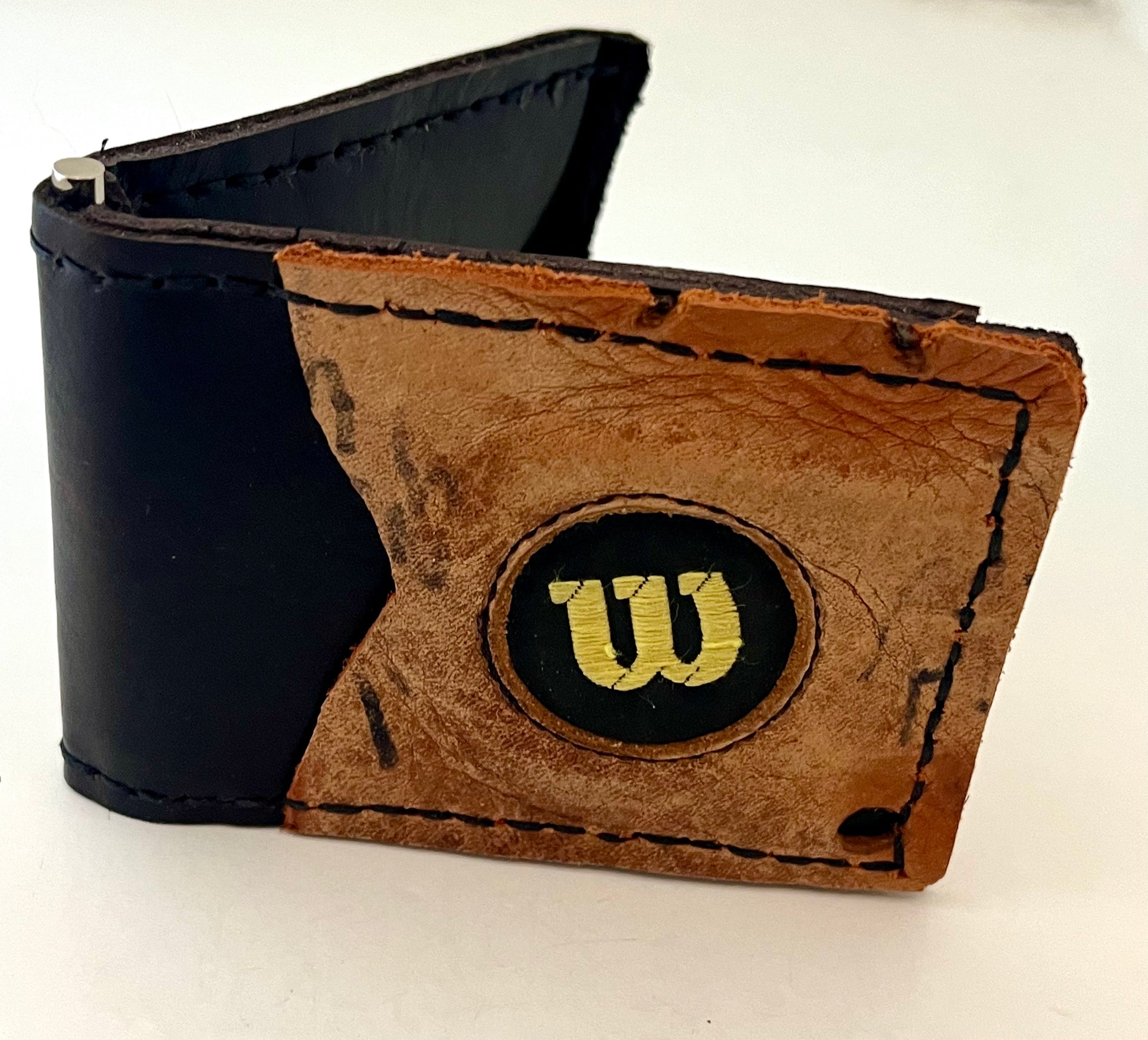 This handy wallets have 3 card pockets, 2 on the interior and one on the front that has been cut from an old baseball glove! They all have a spring loaded money clip to keep your cash in place too.