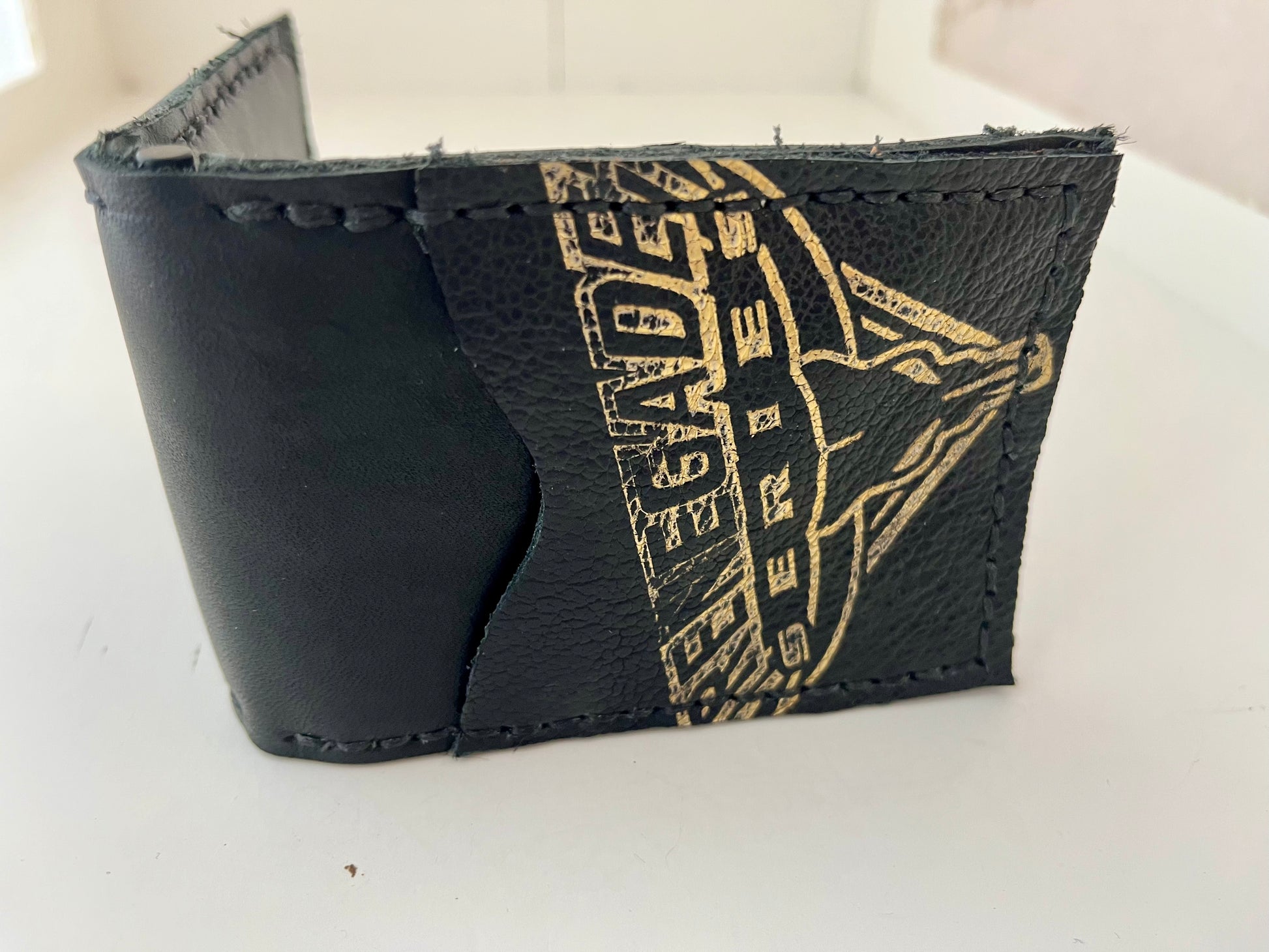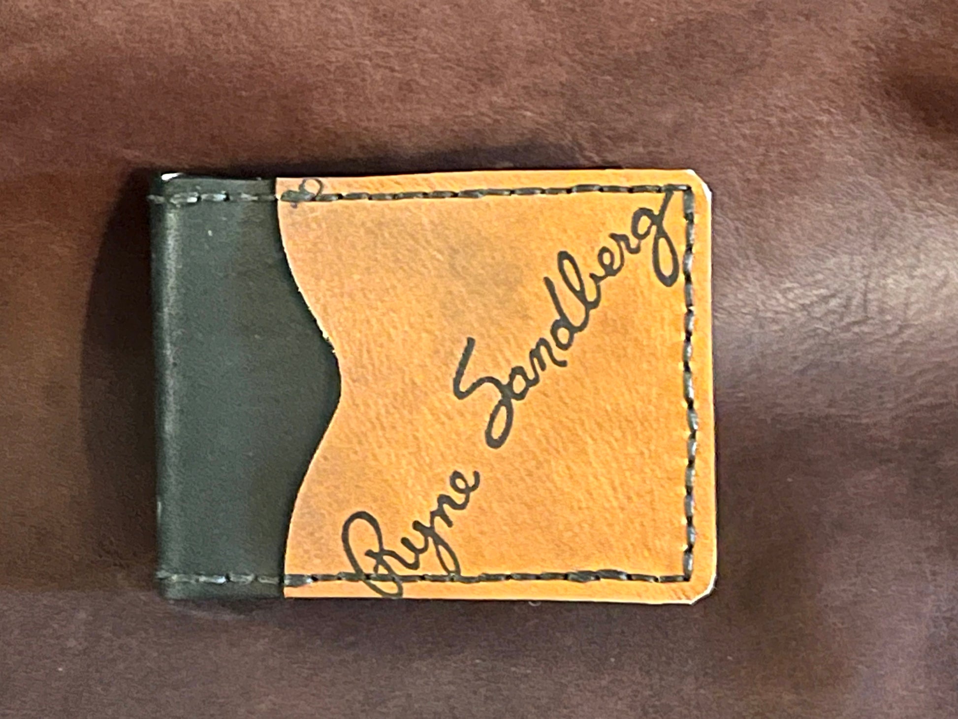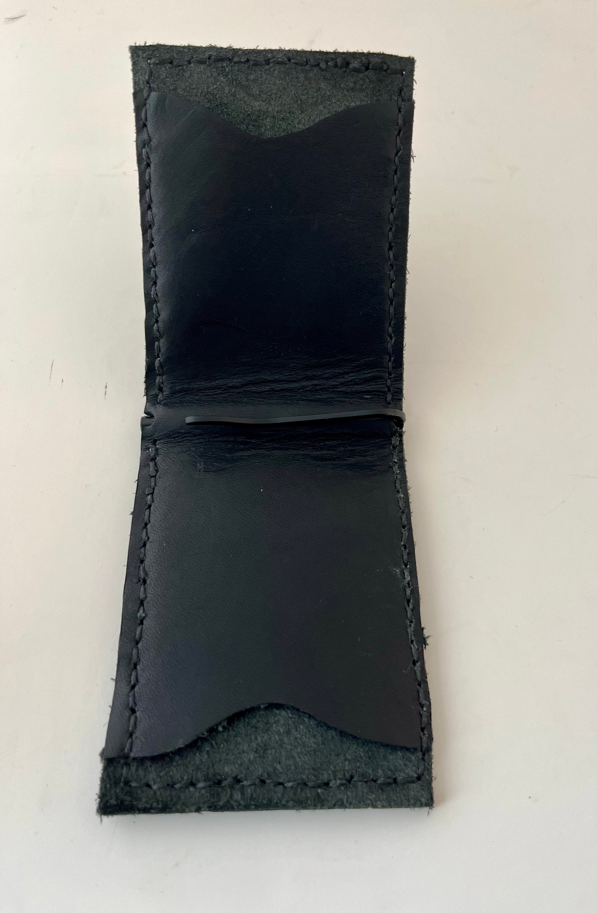 This handy wallets have 3 card pockets, 2 on the interior and one on the front that has been cut from an old baseball glove! They all have a spring loaded money clip to keep your cash in place too.