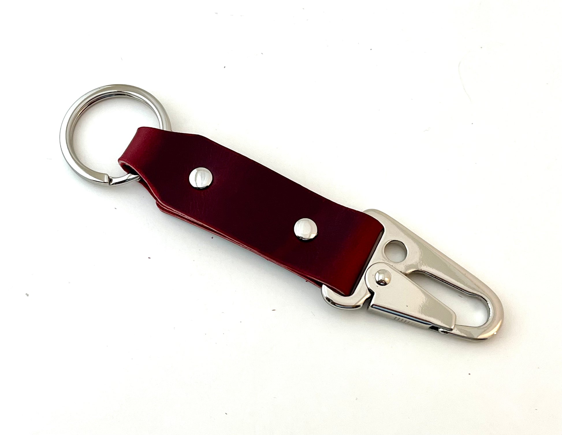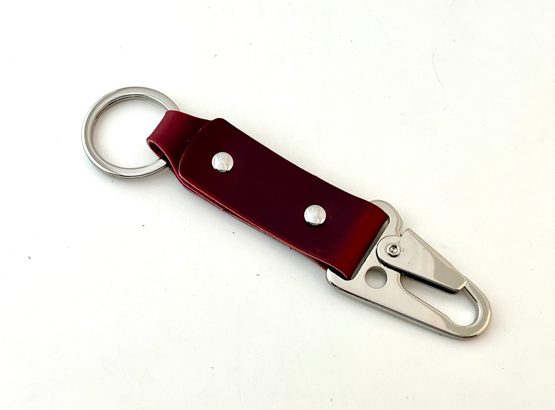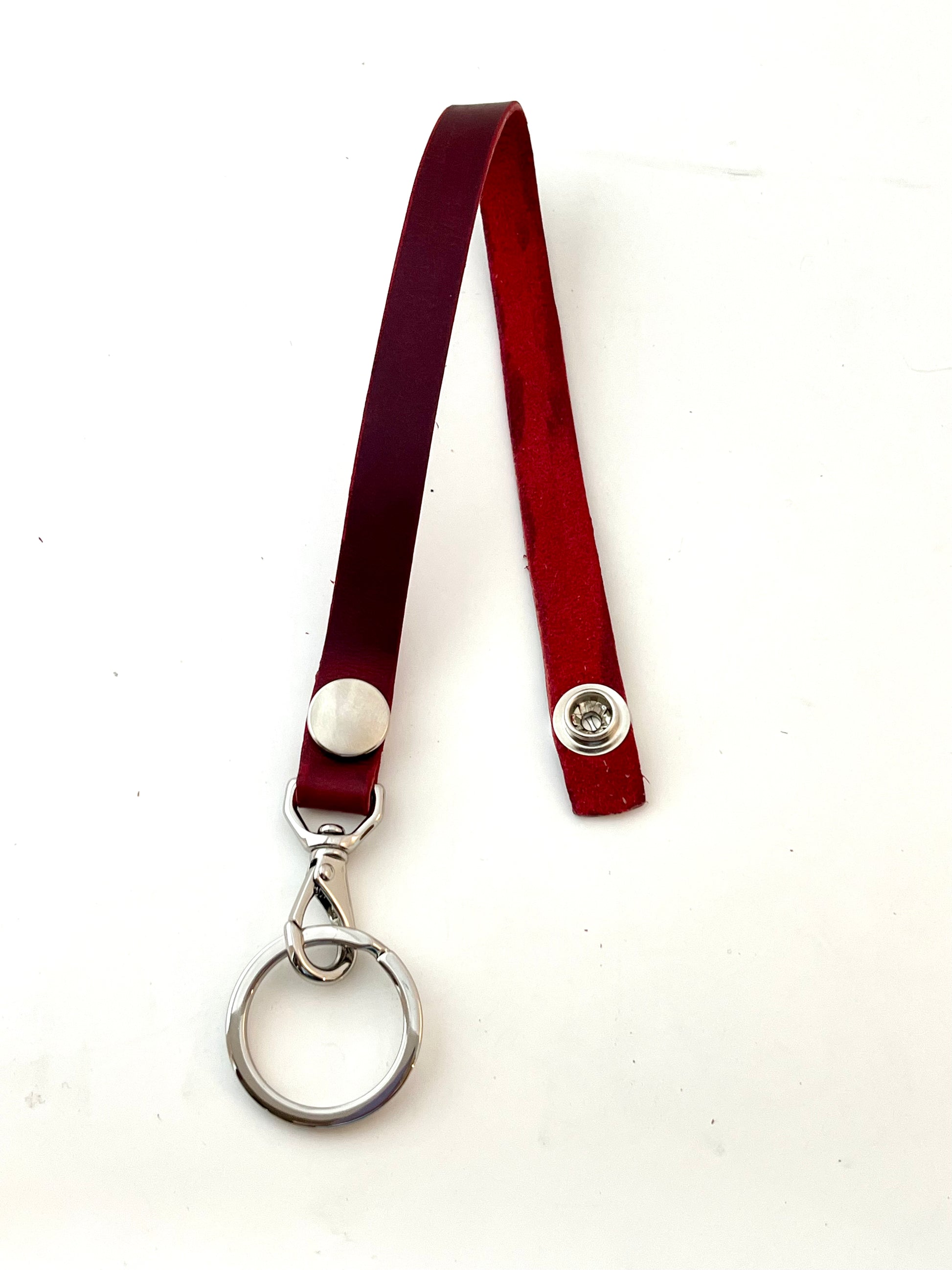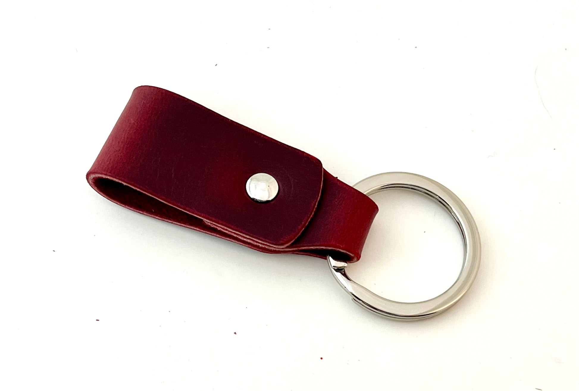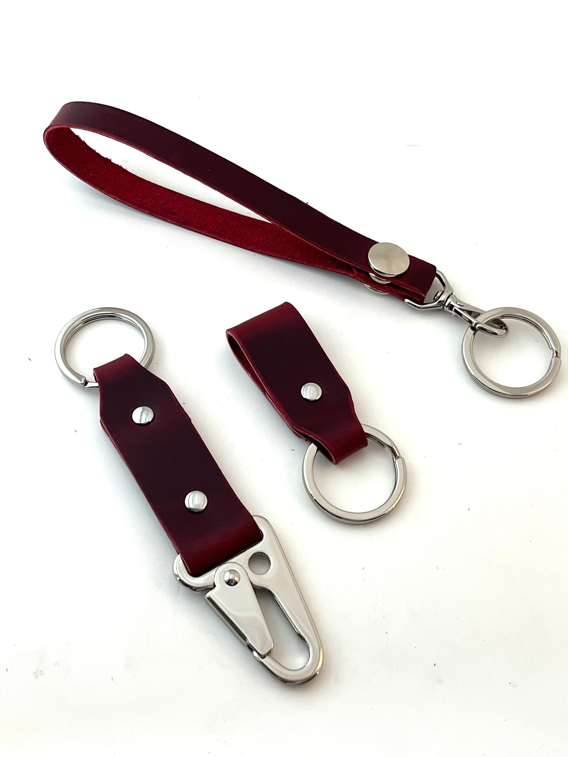 These keychains are made from a beautiful full grain London Bus Red Horween leather. The wristlet keychain has a snap closure to attach around a bag. The dual ended keychain is great for clipping on a belt loop, and the single ring keychain is a perfect size to fit easily in your pocket or a bag.